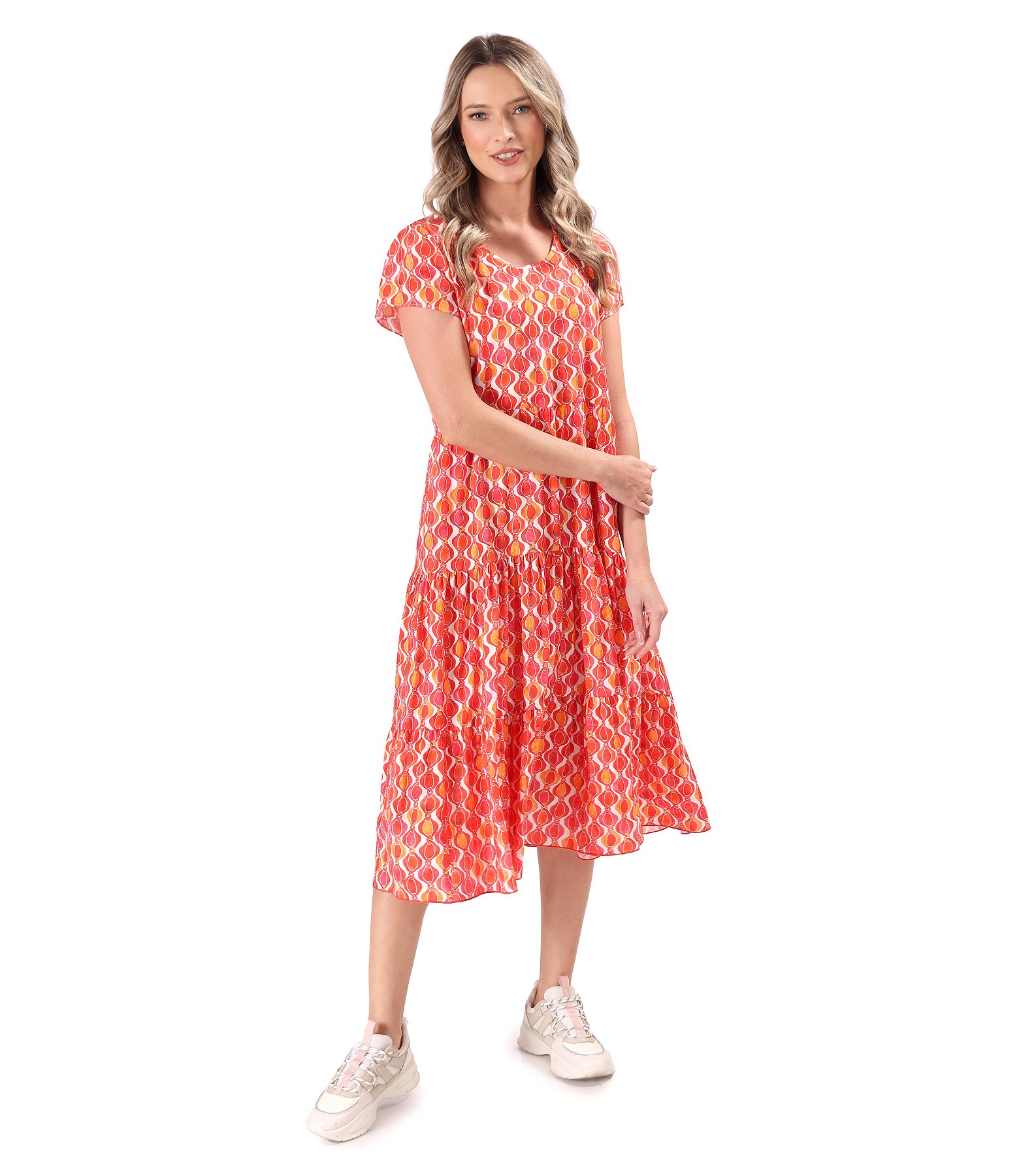 Rochie midi cu volane din viscoza imprimata cu motive geometrice, cu maneci scurte, buzunare laterale si decolteu rotund.