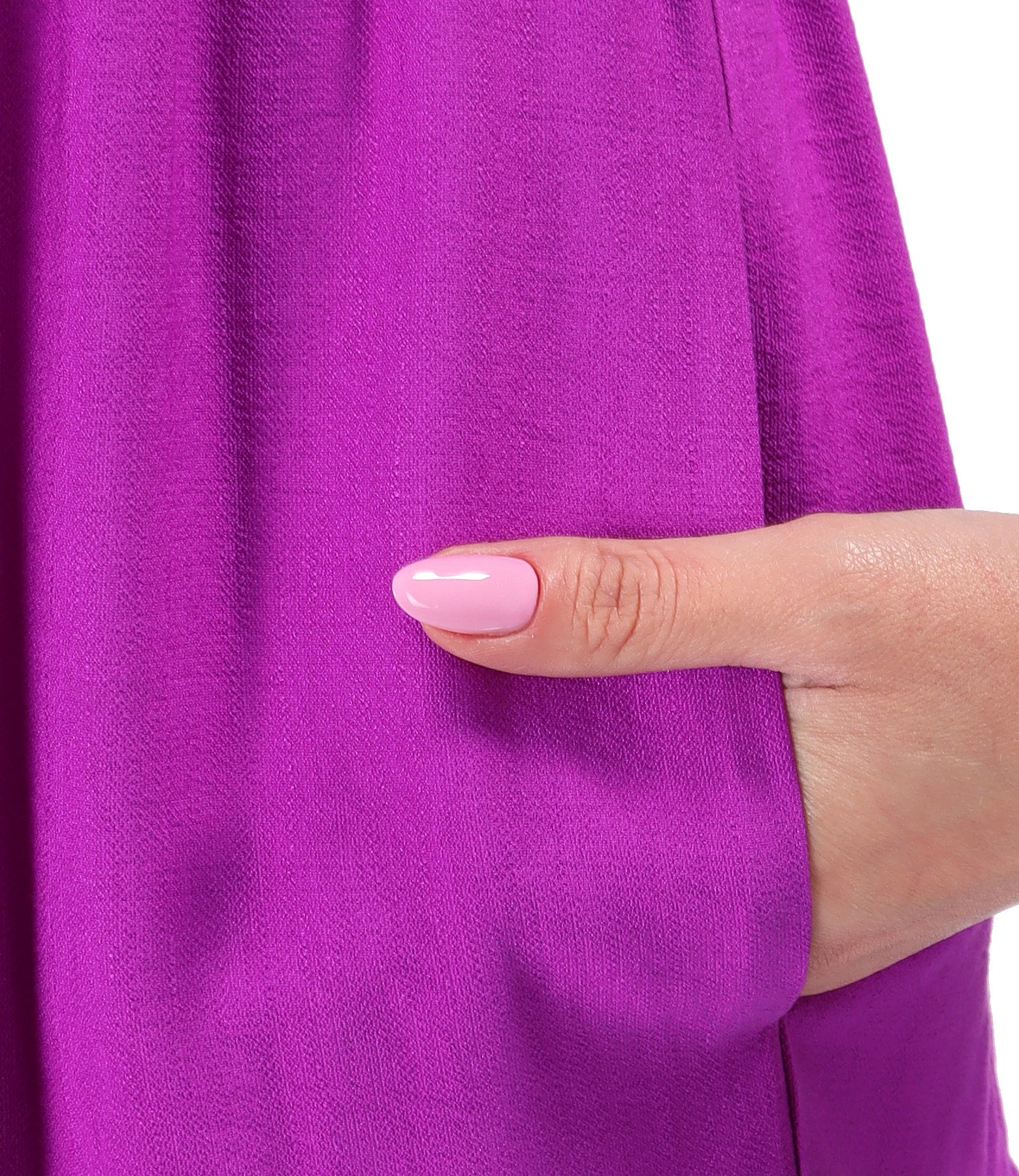Rochie midi cu volane din viscoza uni, cu maneci scurte, buzunare laterale si decolteu rotund cu aplicatie decorativa. Nu are sistem de inchidere.