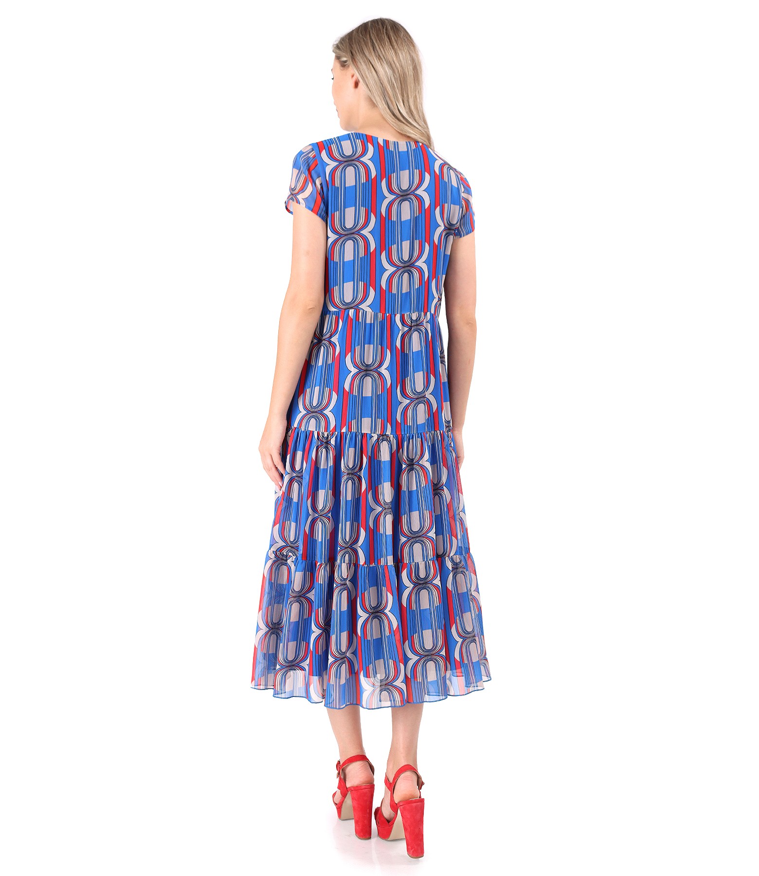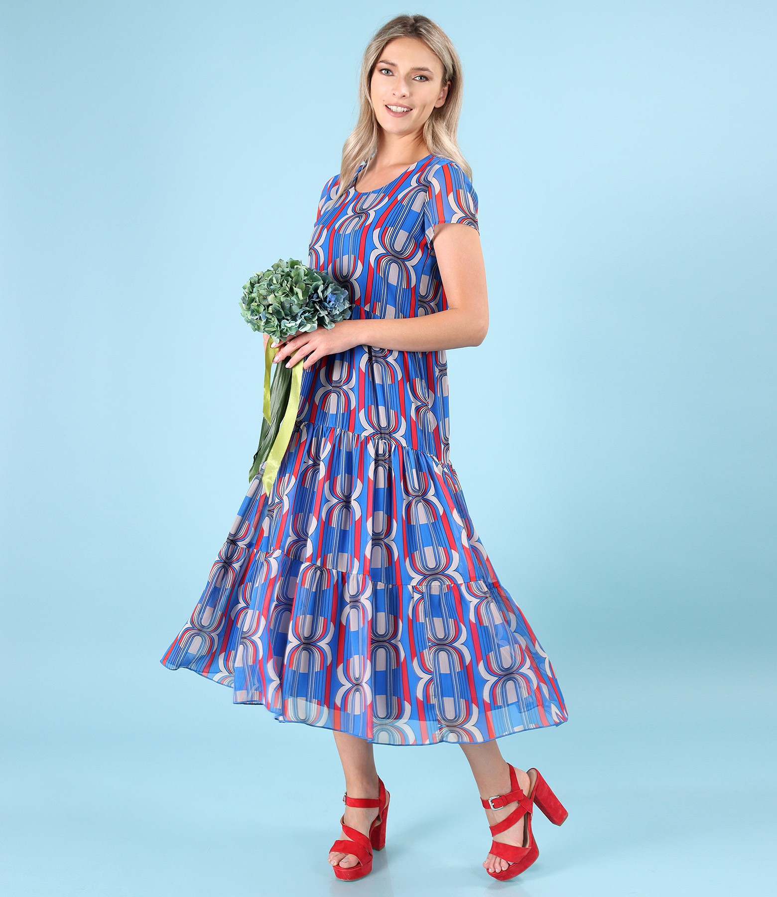 Rochie midi cu volane din voal imprimat digital cu motive geometrice, dublata cu viscoza, cu maneci scurte si decolteu rotund. Nu are sistem de inchidere.