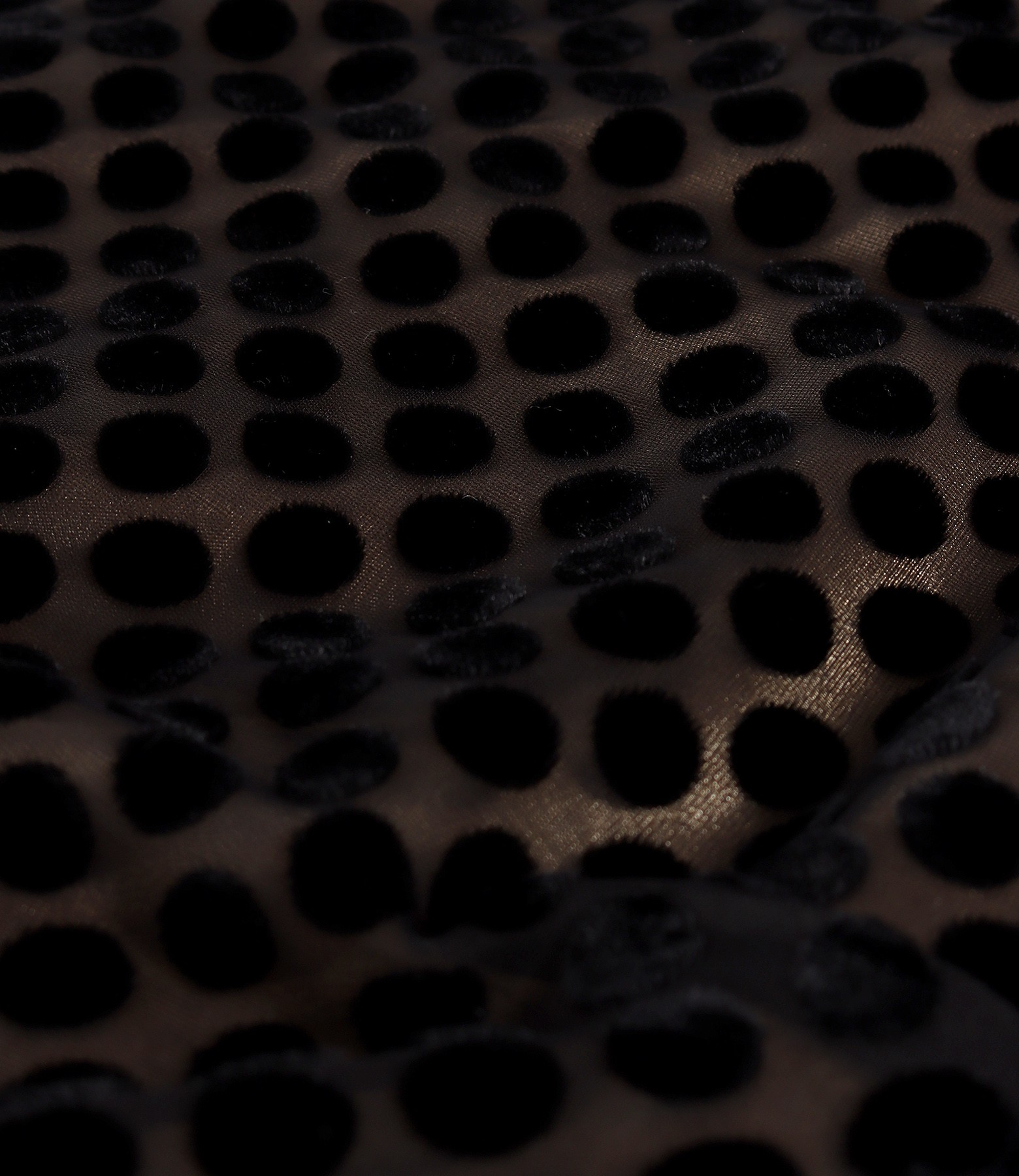 Rochie midi de cocktail cu fusta din catifea, cu maneci si bust din voal cu buline din catifea, dublata in partea de sus cu satin auriu. Are gulerul si mansetele din catifea. Se inchide cu fermoar ascuns pe mijloc spate.