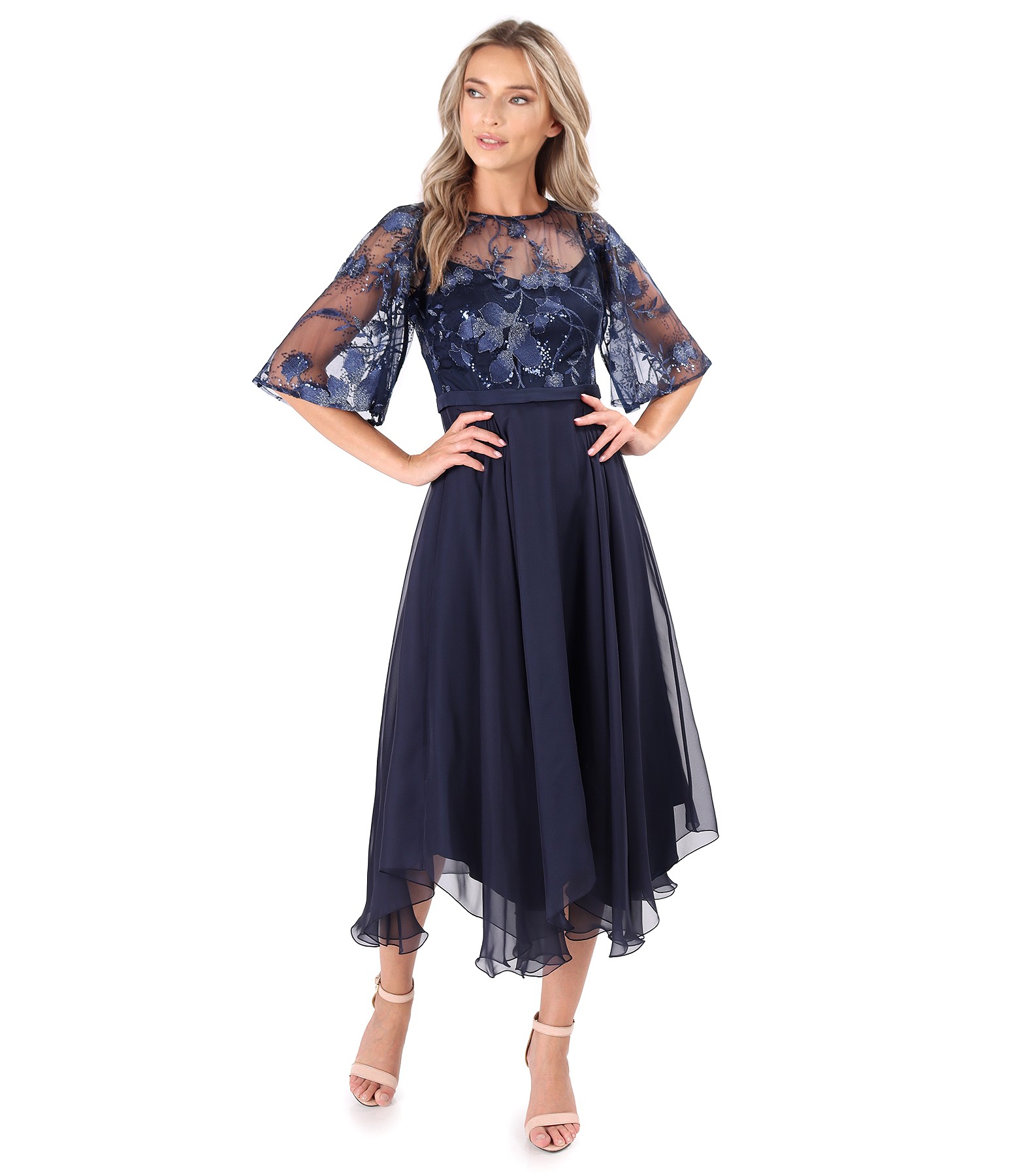 Rochie midi de ocazie din voal cu corsaj si maneci din voal cu paiete (Bleumarin), marimea