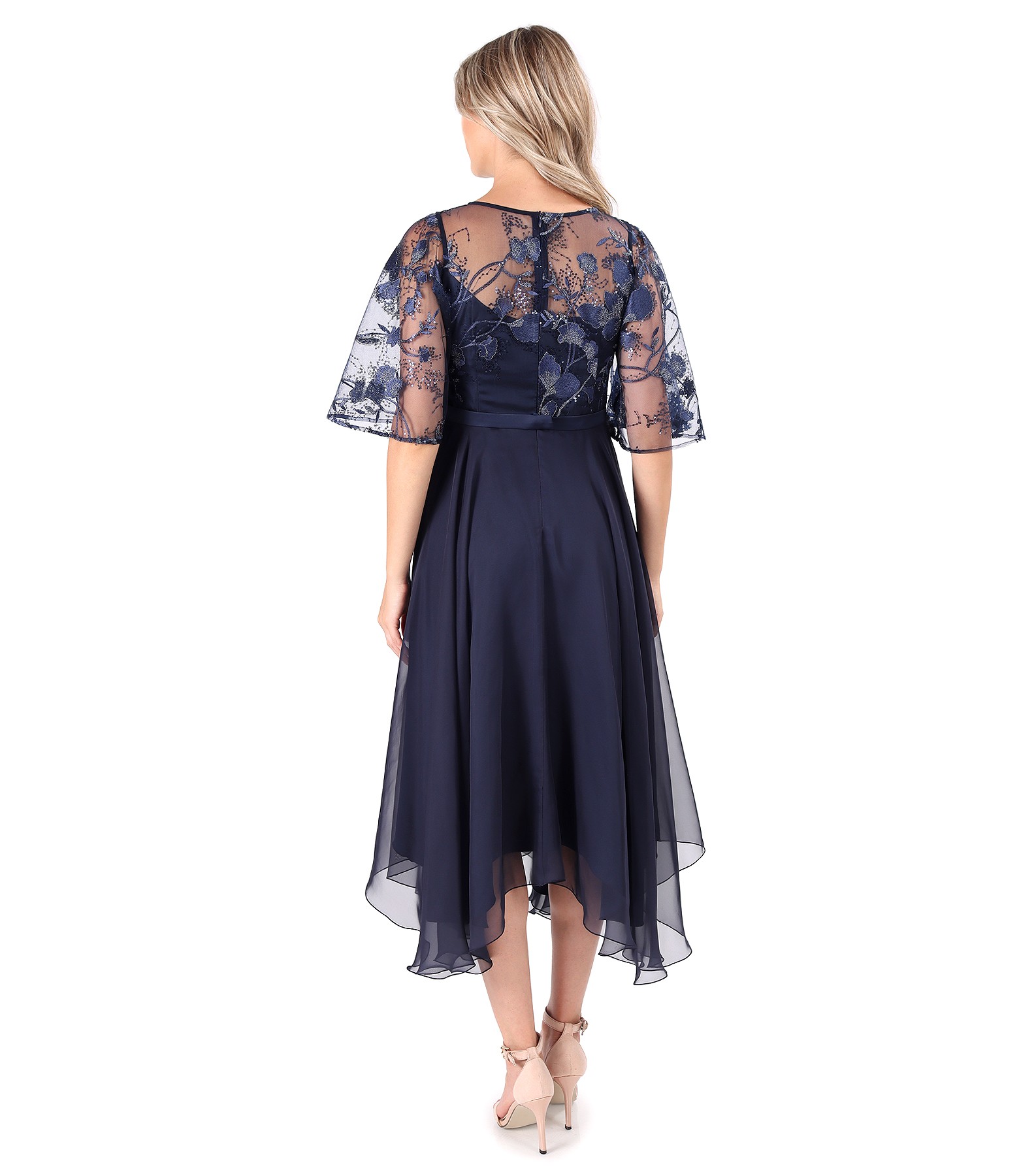 Rochie midi de ocazie din voal, cu corsaj din voal cu paiete cu motive florale, captusita cu saten elastic. Are cordon cordon in talie si maneci ample din voal cu paiete si decolteu rotund. Se inchide cu fermoar ascuns pe mijloc spate.