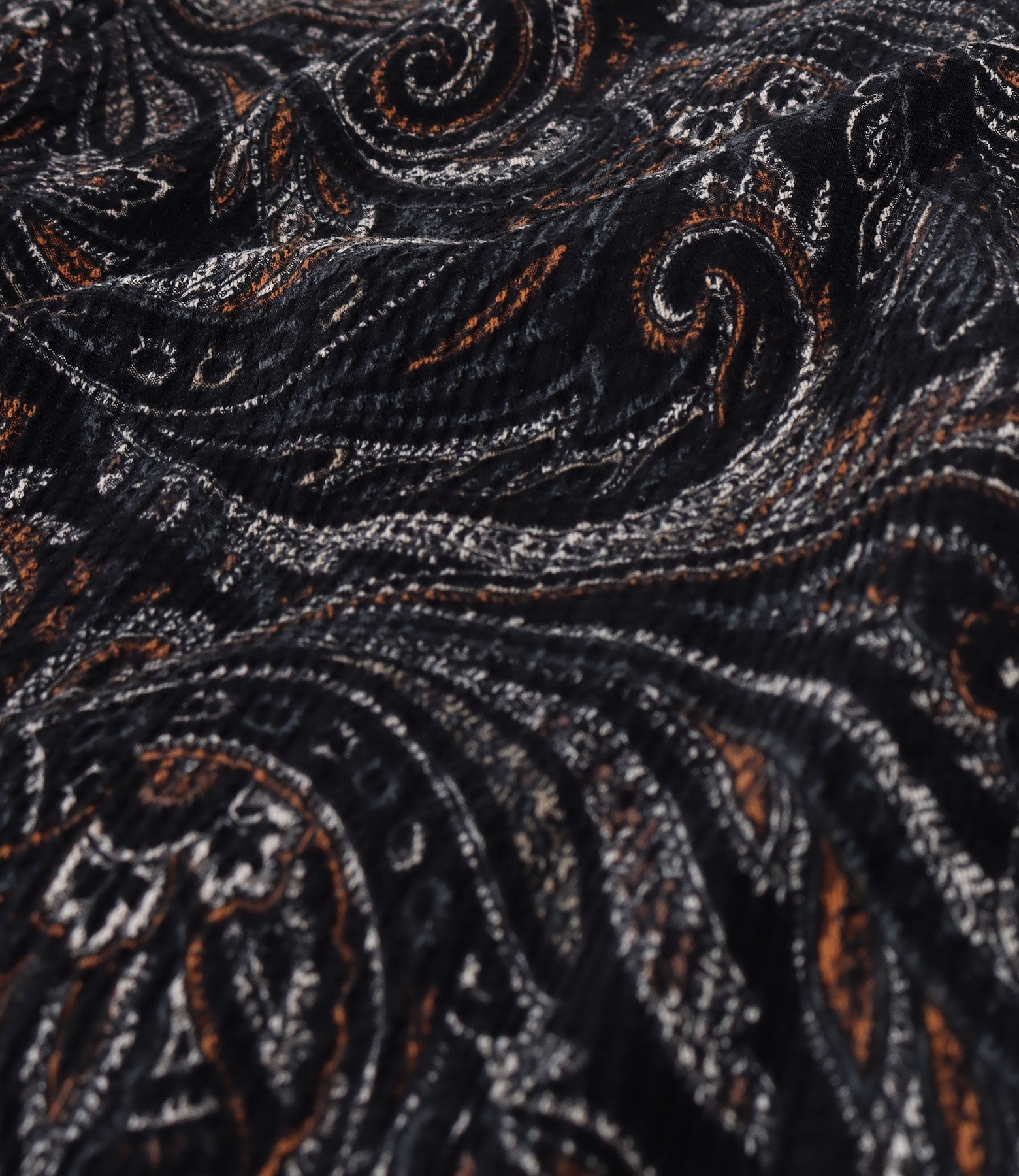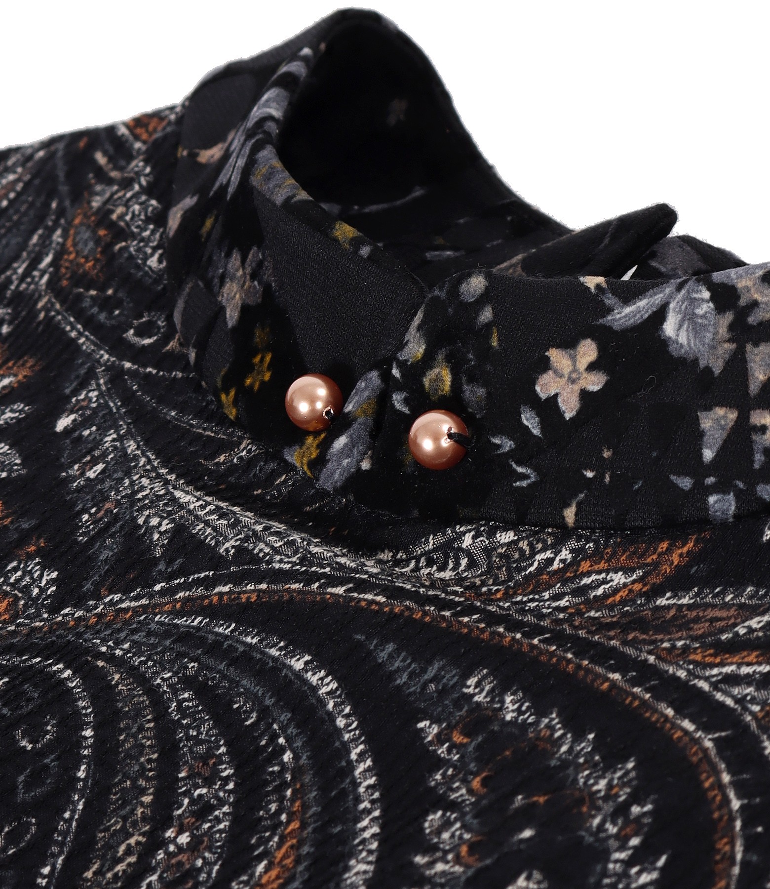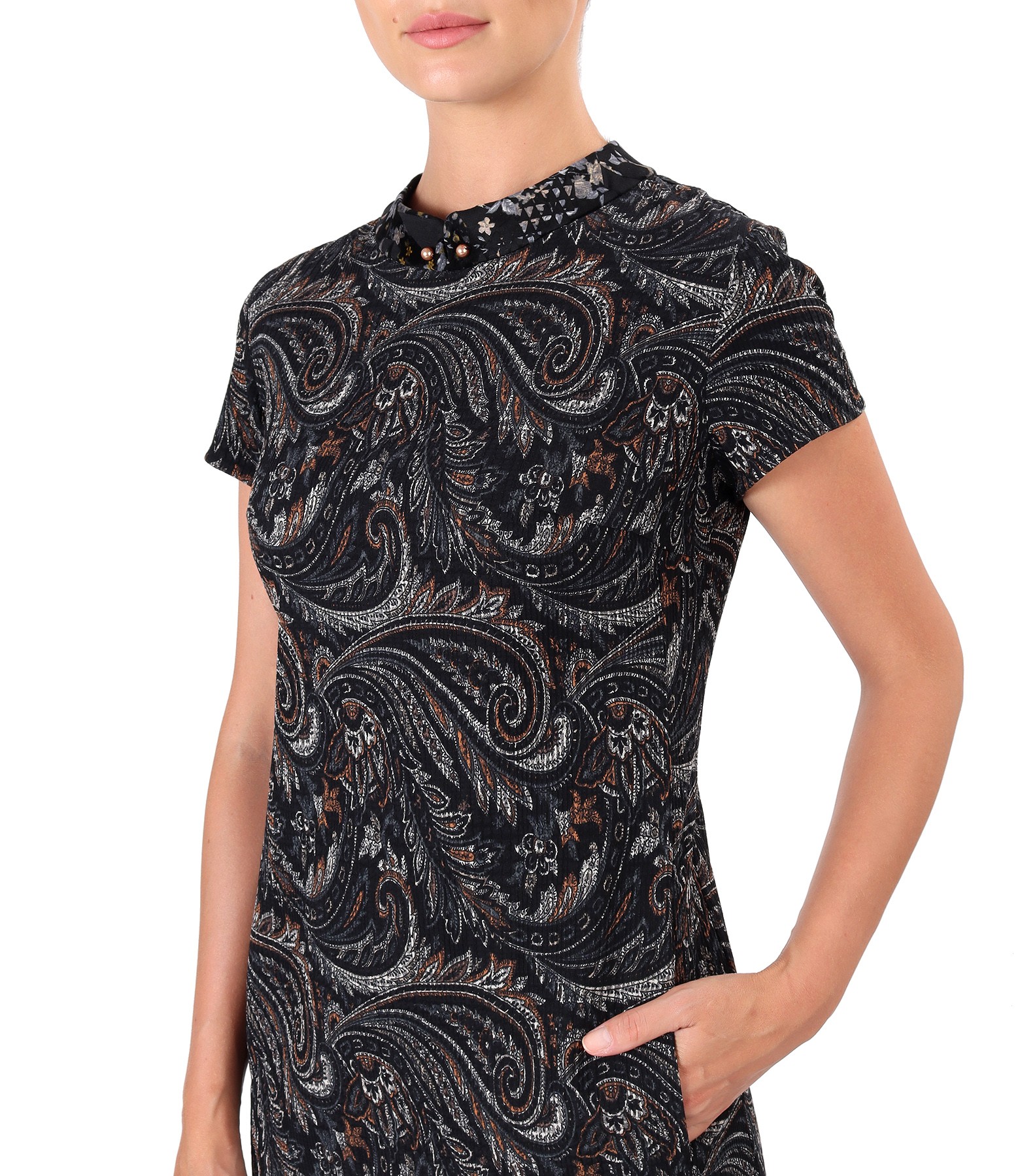 Rochie midi din brocart elastic cu striatii in relief si motive paisley, necaptusita, cu maneci scurte, buzunare laterale, guler tunica cu perle. Se inchide cu fermoar ascuns pe mijloc spate.