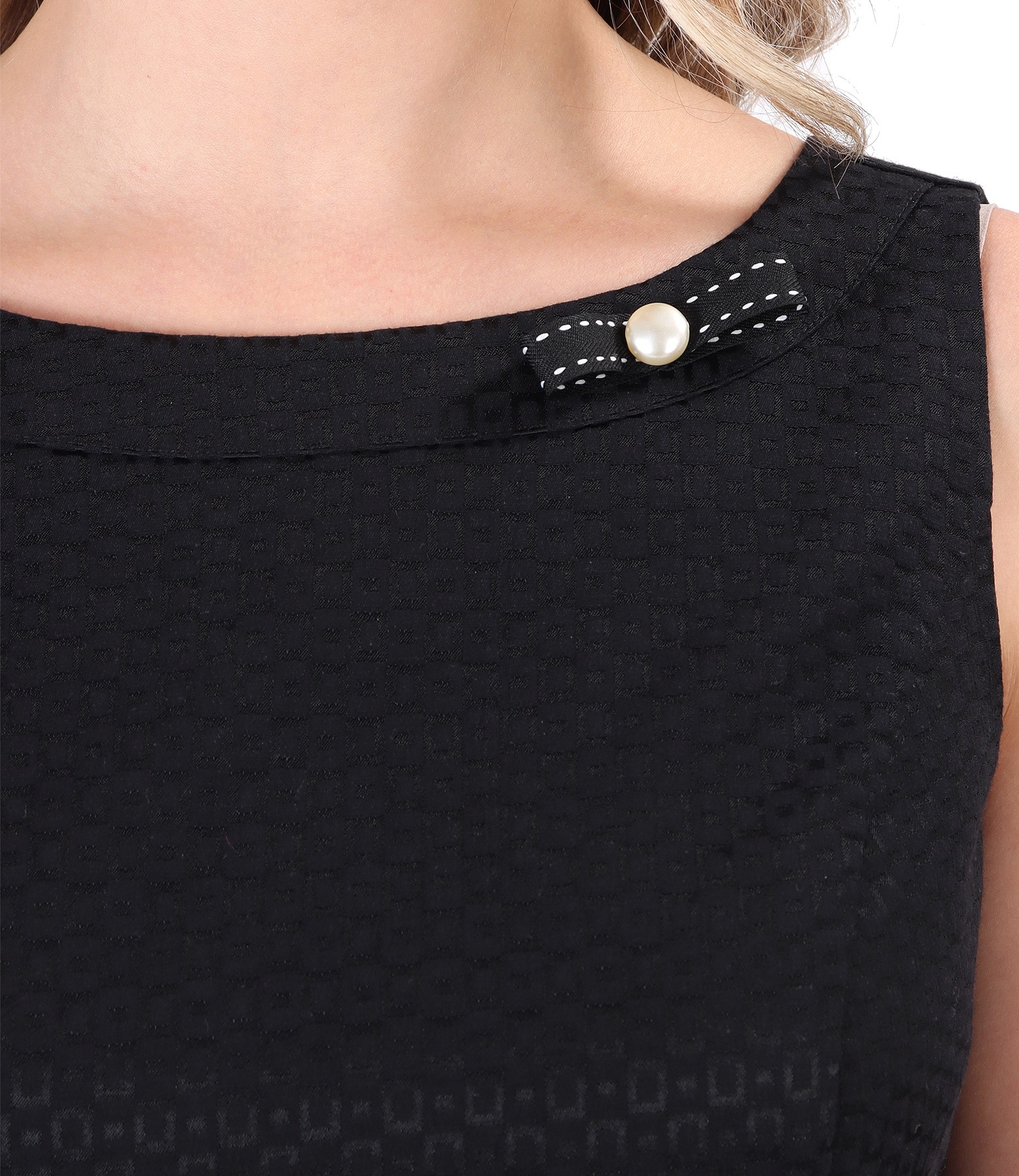 Rochie midi din bumbac elastic texturat, fara maneci, necaptusita, cu decolteu in V la spate si funda din rips si perla fixata la decolteu. Se inchide cu fermoar ascuns pe mijloc spate.