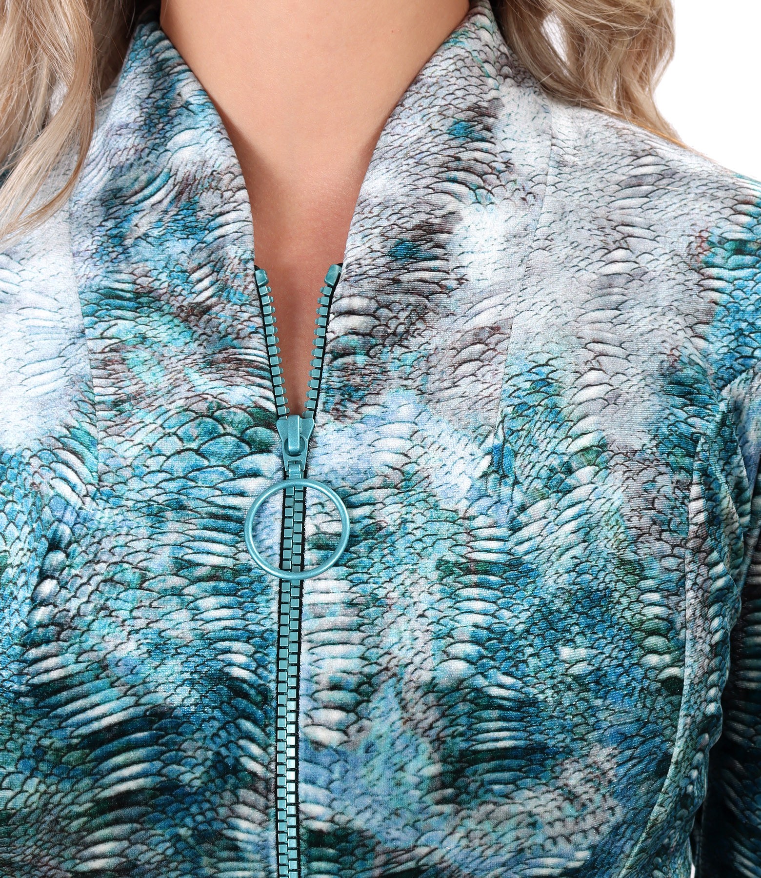 Rochie midi din catifea elastica imprimata, captusita, cu fermoar cu dubla deschidere pe mijloc fata, maneci lungi si guler gen tunica.