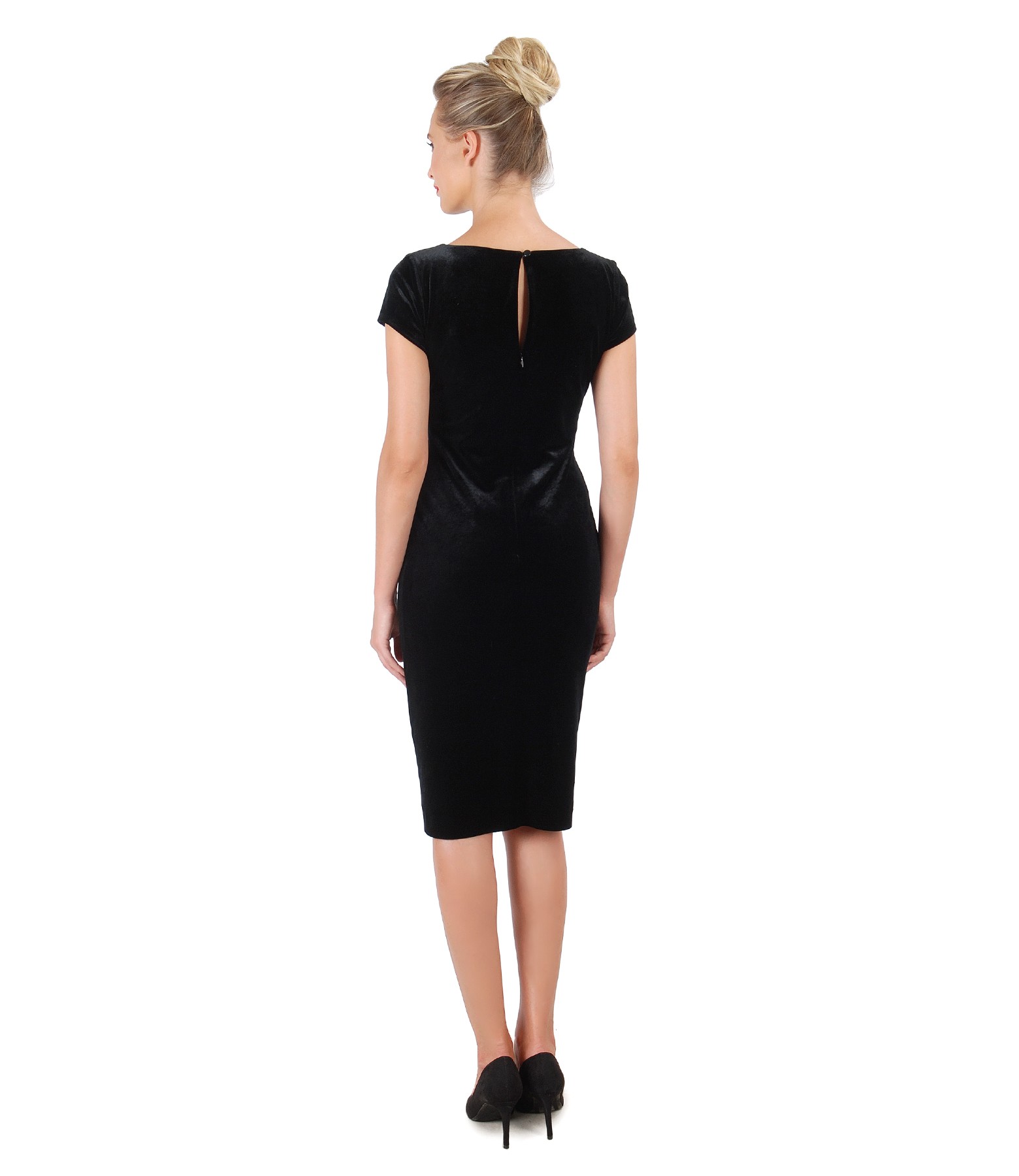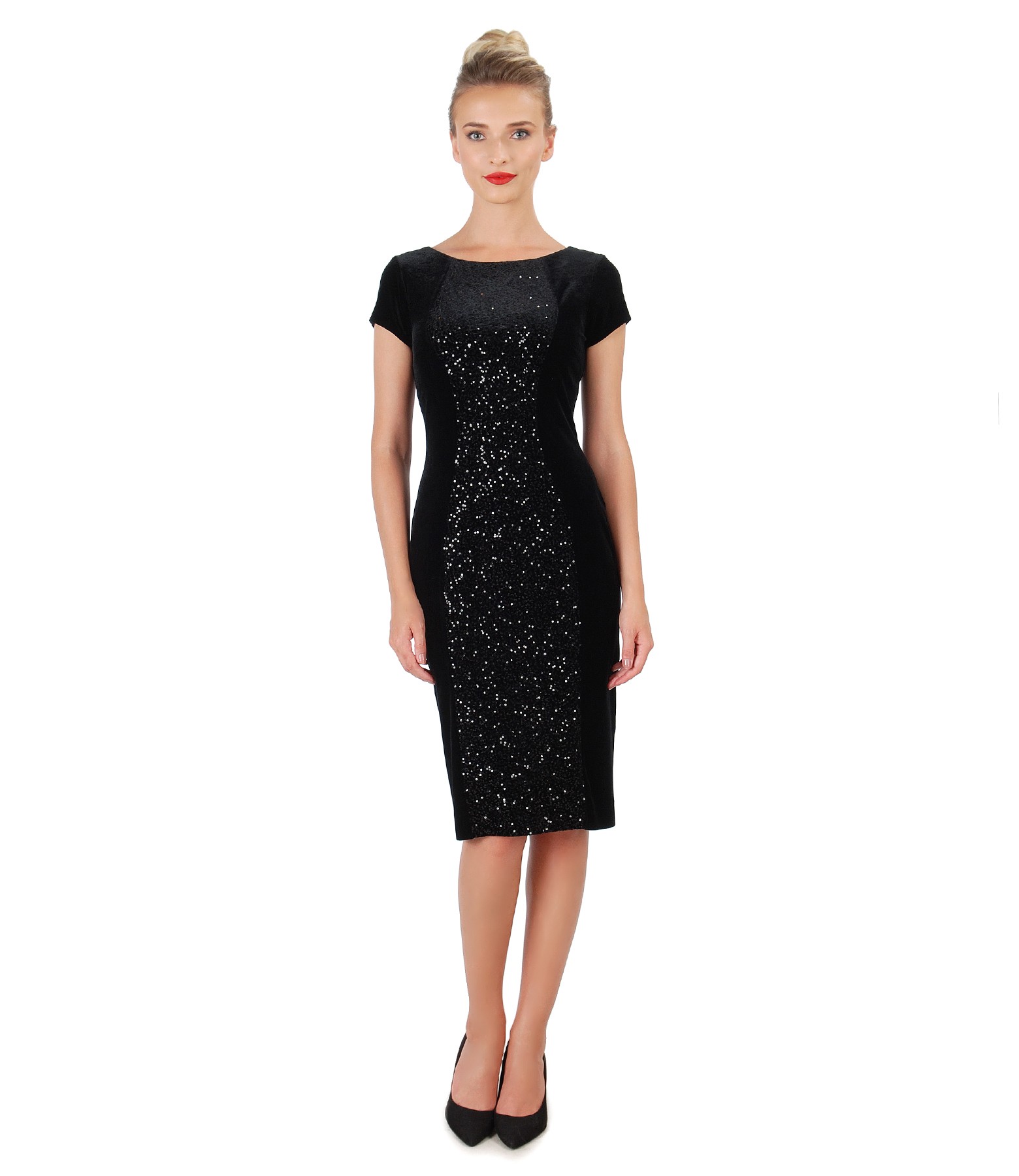 Rochie din catifea elastica neagra, cu decolteu rotund, maneci scurte si insertie cu paiete pe mijloc fata. Se inchide cu fermoar ascuns pe mijloc spate.