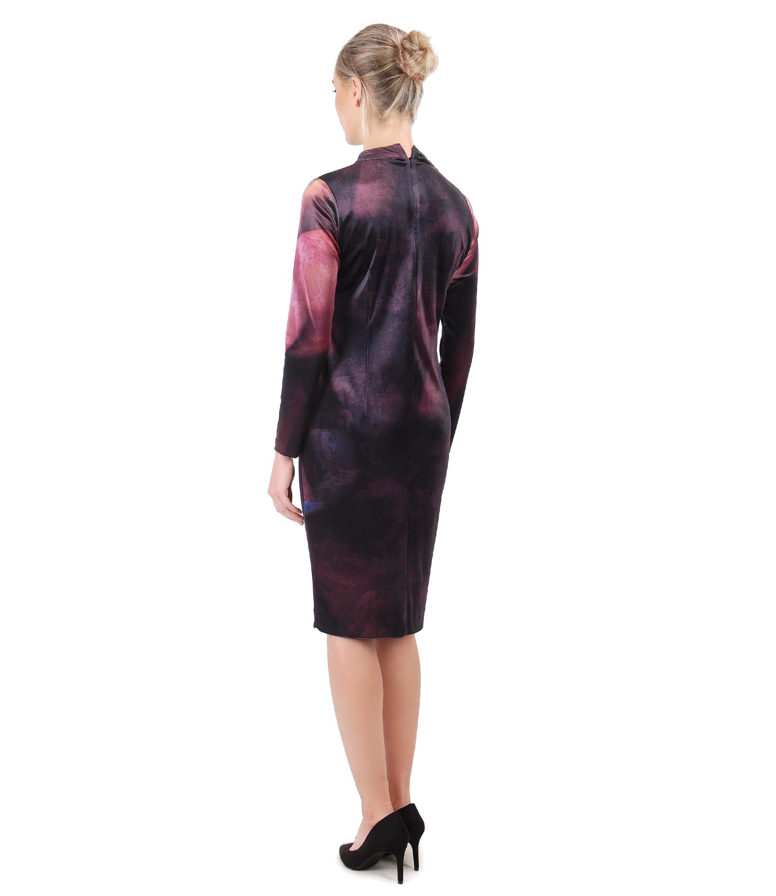 Rochie necaptusita din catifea elastica imprimata, cu guler tunica, maneci lungi. Se inchide cu ascuns metalic pe mijloc spate.