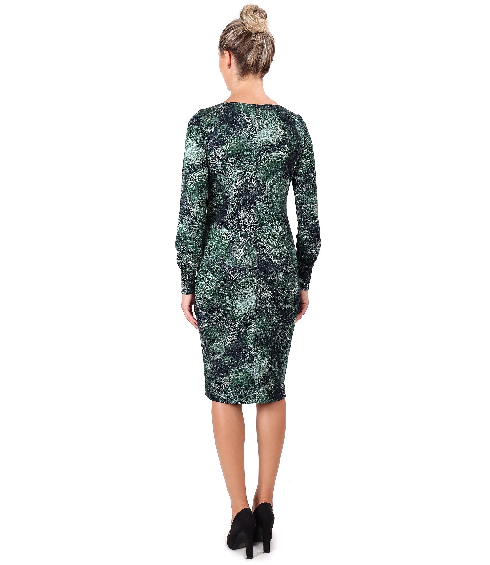 Rochie midi din jerse elastic gros imprimat cu motive geometrice, captusita, cu maneci lungi cu mansete si decolteu in V. Se inchide cu fermoar ascuns pe mijloc spate.