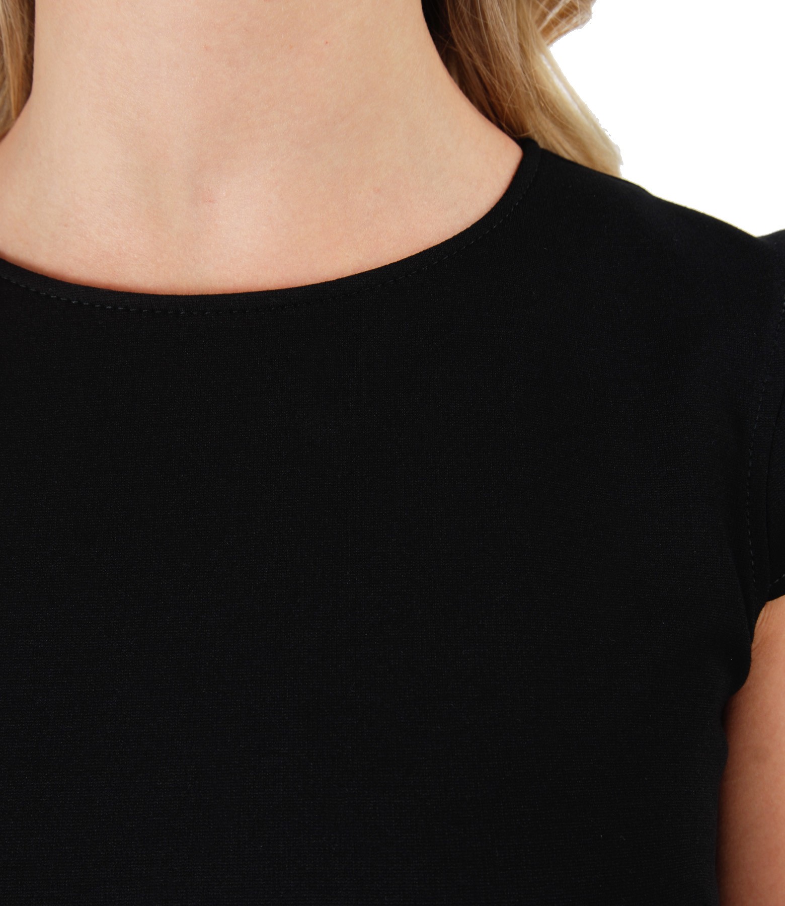 Rochie midi necaptusita din jerse elastic gros, cu decolteu rotund si maneci scurte tip aripioara. Se inchide cu fermoar ascuns pe mijloc spate.