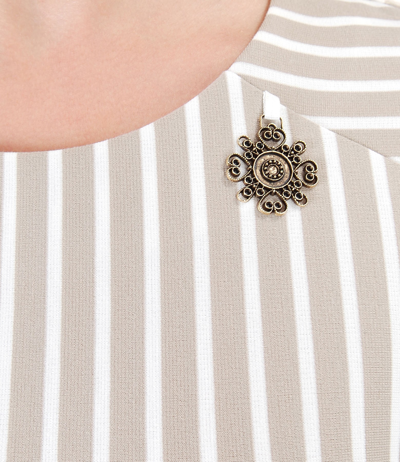 Rochie midi din jerse elastic cu dungi, necaptusita, cu maneci scurte, decolteu rotund si accesoriu metalic pe decolteu. Se inchide cu fermoar ascuns pe mijloc spate.