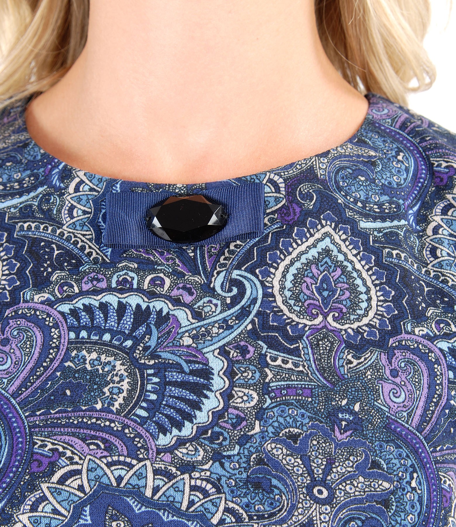 Rochie midi, necaptusita, din jerse elastic cu viscoza, imprimat cu motive florale, cu maneci tip aripioara si funda din rips pe decolteu. Se inchide cu fermoar ascuns pe mijloc spate.