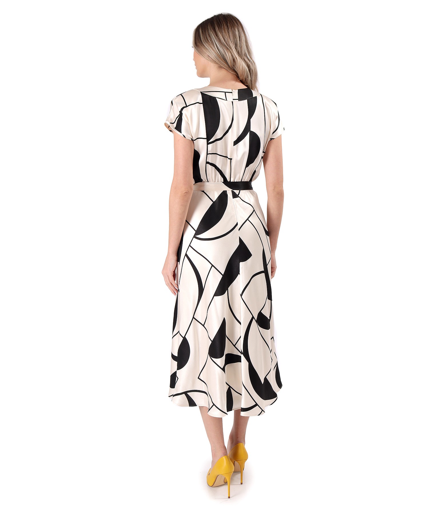 Rochie midi din satin de viscoza imprimata cu motive geometrice, cu bustul petrecut, cu cordon in talie si maneci scurte. Este dublata in partea de jos cu viscoza.