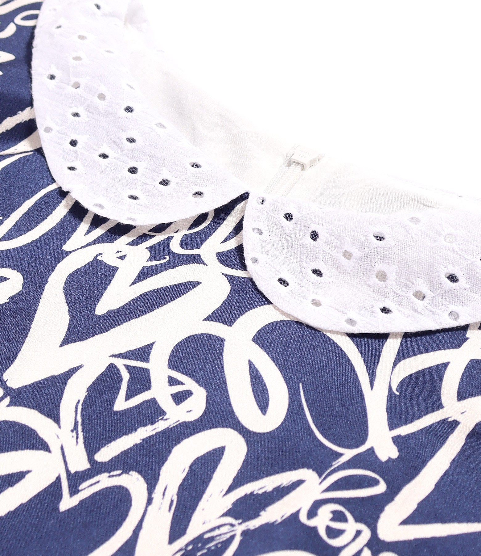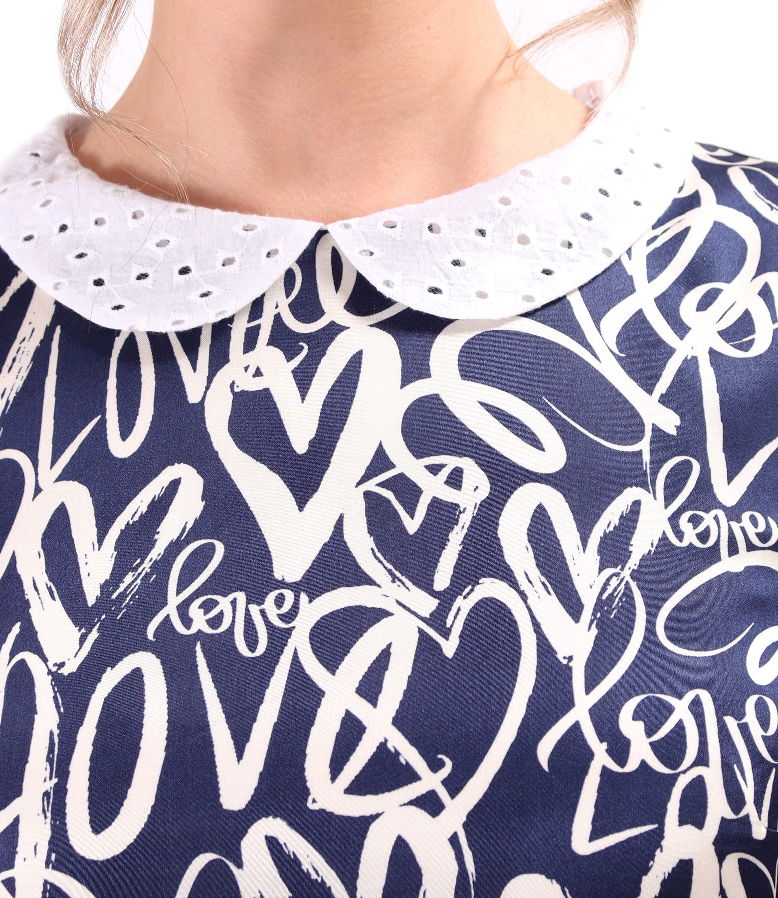 Rochie midi din satin de viscoza imprimata cu inimi, dublata cu viscoza, cu guler din dantela sparta, fara maneci. Se inchide cu fermoar ascuns pe mijloc spate. Imprimeul variaza per produs.