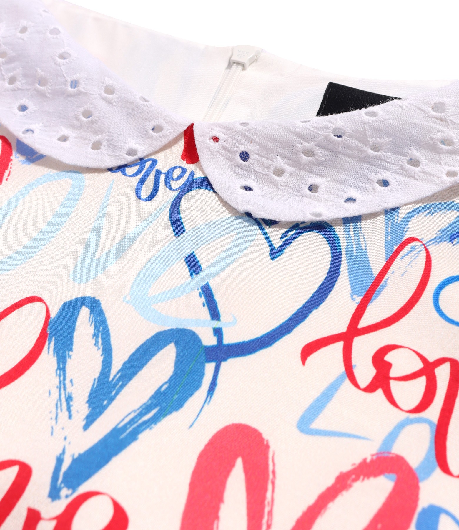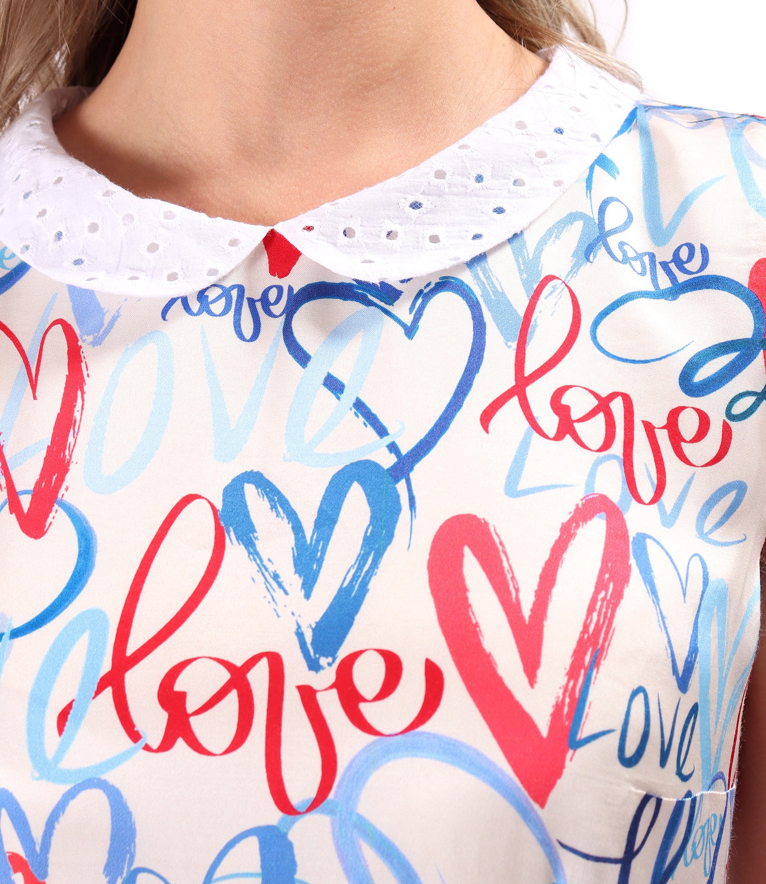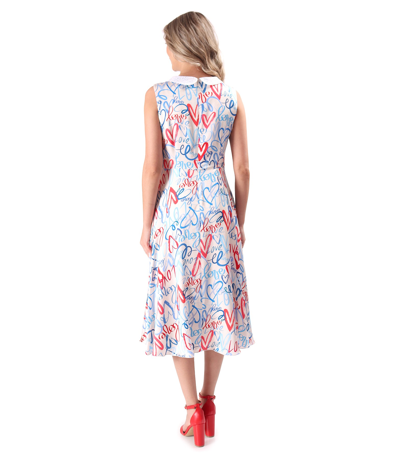 Rochie midi din satin de viscoza imprimata cu inimi, cu guler din dantela sparta, fara maneci. Se inchide cu fermoar ascuns pe mijloc spate. Imprimeul variaza per produs.