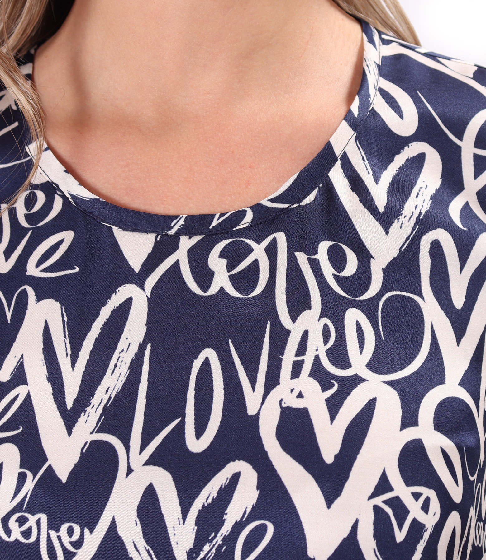 Rochie midi din satin de viscoza imprimata cu inimi, decolteu rotund si cu maneci scurte. Se inchide cu un nasture pe mijloc spate. Pozitia imprimeului variaza per produs.
