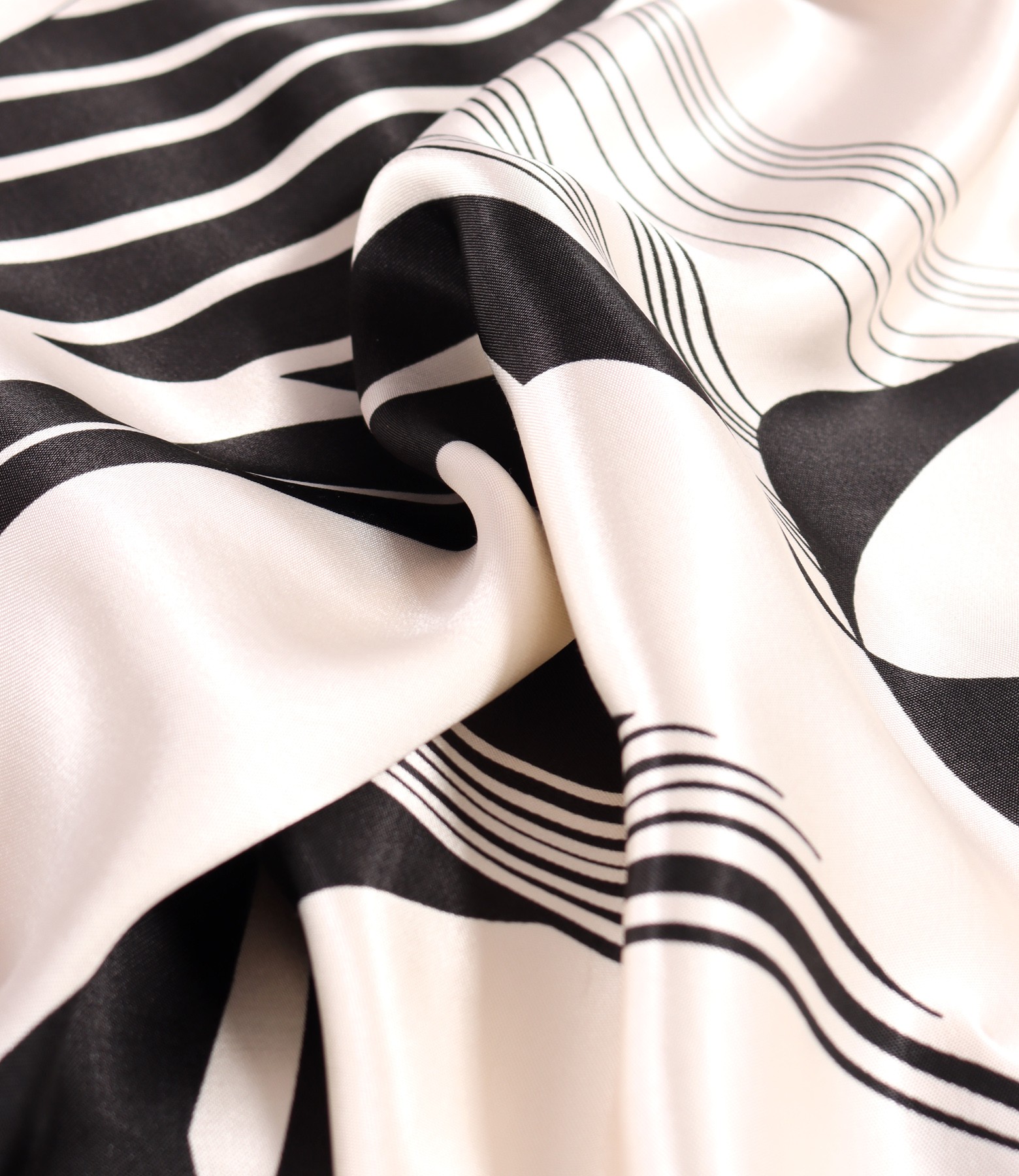 Rochie midi din satin de viscoza imprimata cu motive geometrice, dublata cu viscoza, cu maneci 3/4 usor evazate si guler rotund. Se inchide cu fermoar ascuns pe mijloc spate.