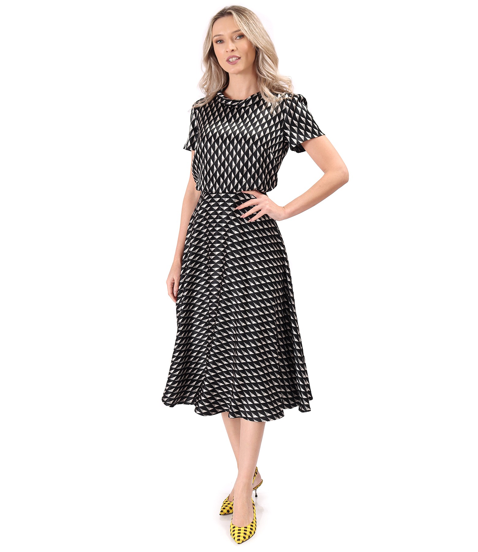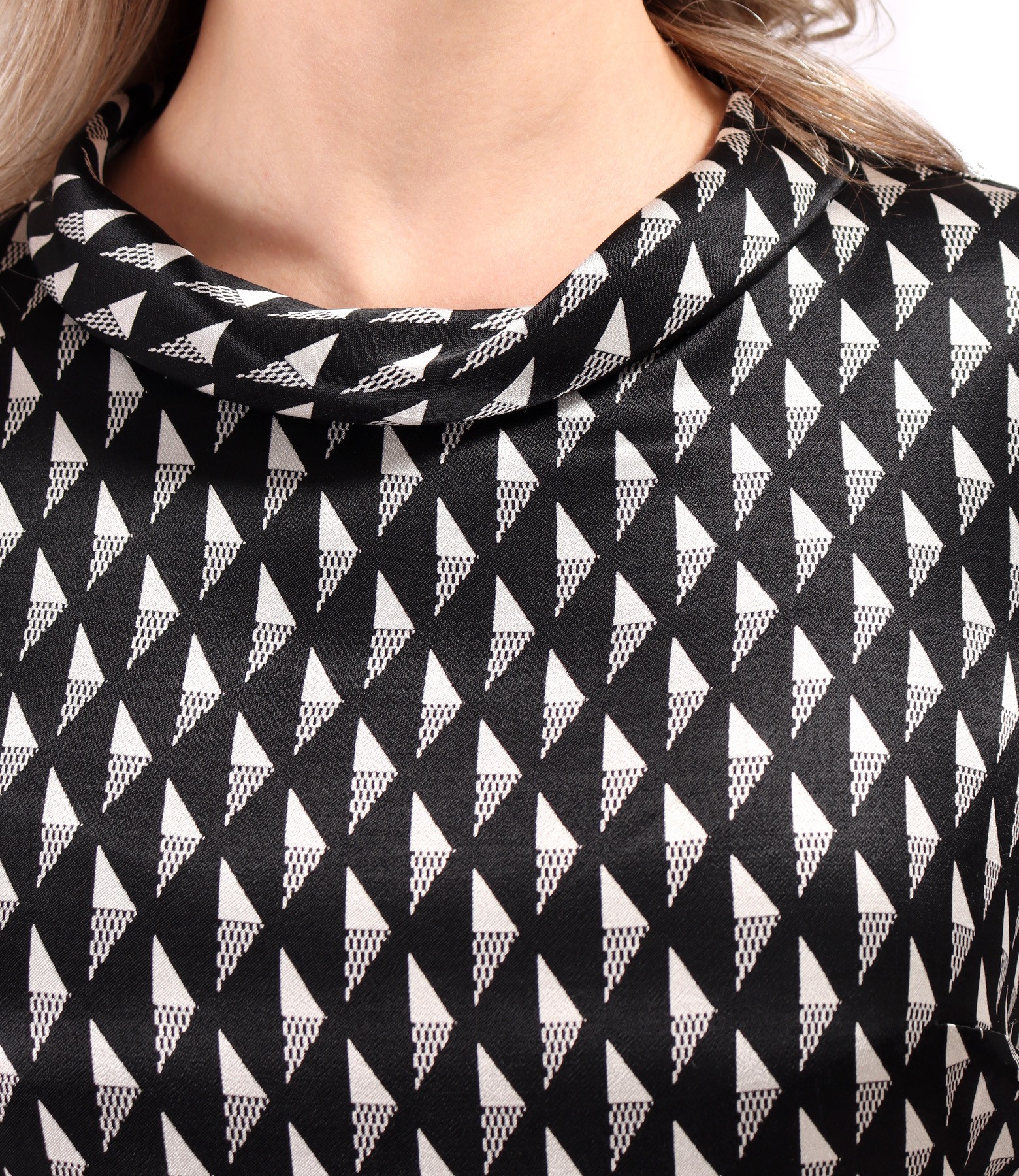 Rochie midi din satin de viscoza imprimata cu motive geometrice, cu maneci scurte si guler rotund. Bustul este dublat cu viscoza. Se inchide cu fermoar ascuns pe mijloc spate.