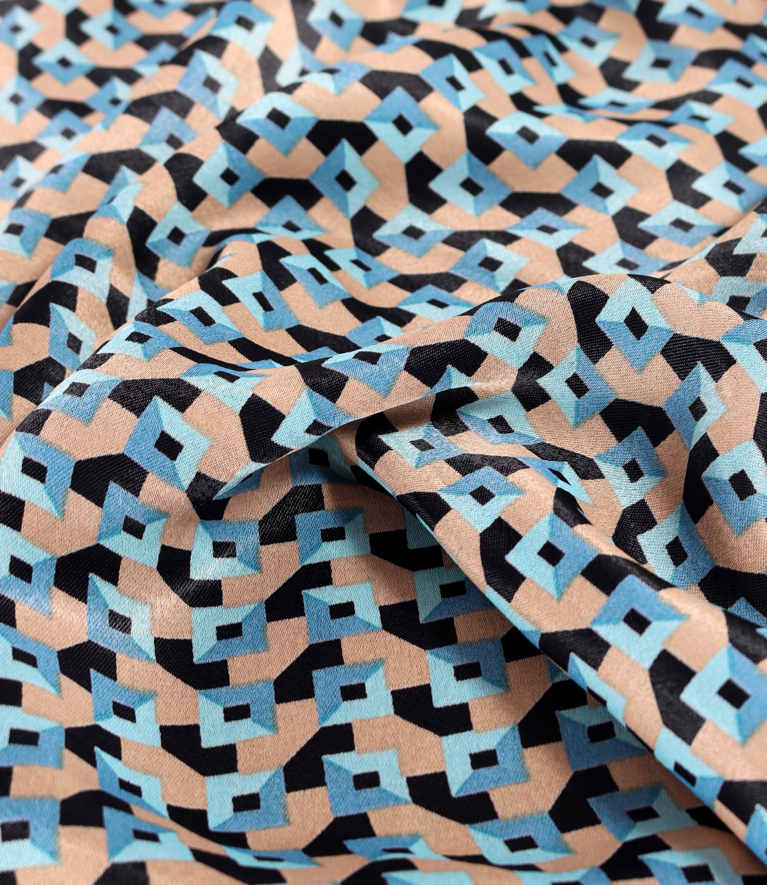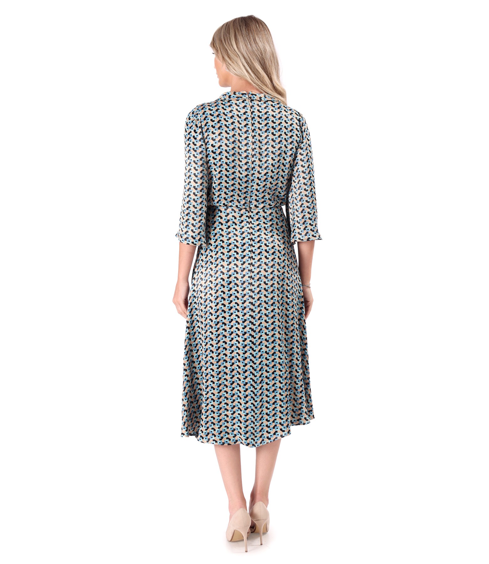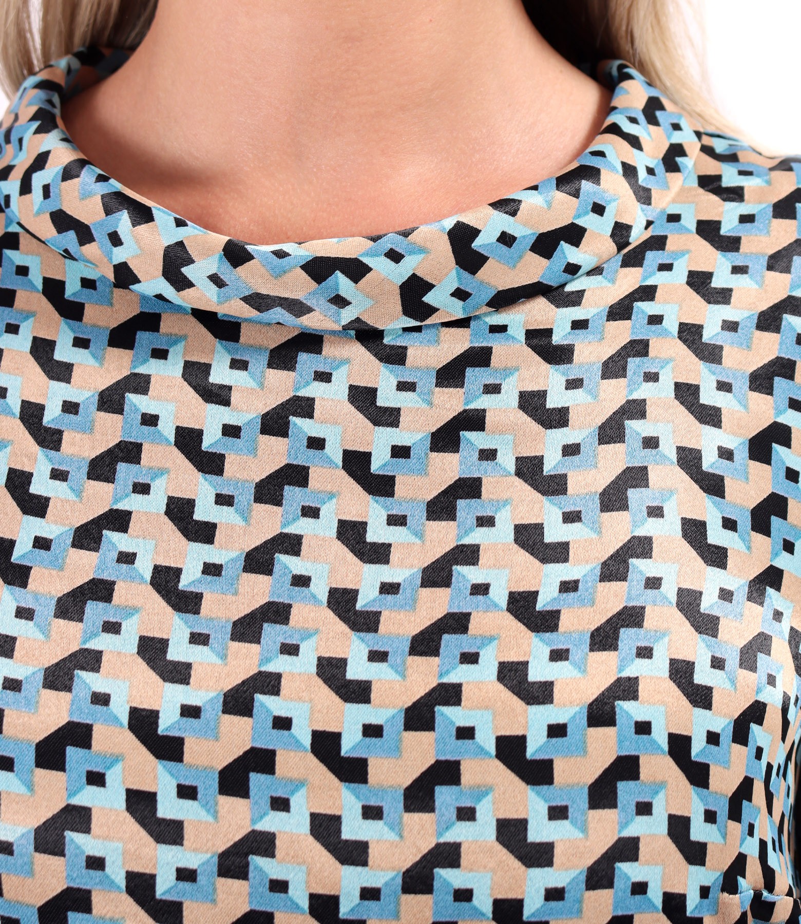 Rochie midi din satin de viscoza imprimata cu motive geometrice, cu maneci 3/4 usor evazate si guler rotund. Bustul este dublat cu viscoza. Se inchide cu fermoar ascuns pe mijloc spate.