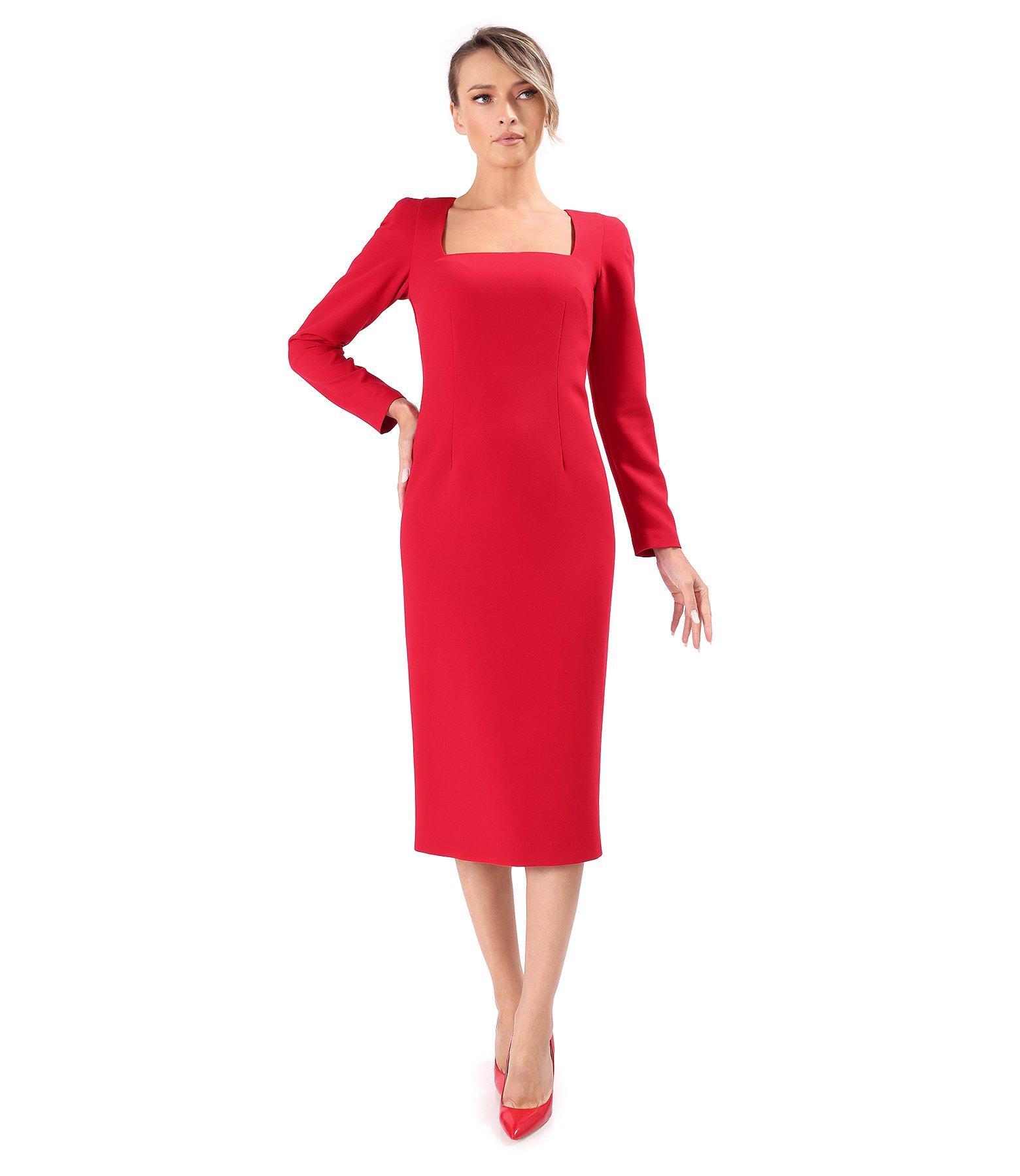 Rochie midi din stofa elastica cu viscoza, captusita, cu maneci lungi, decolteu patrat si cu slit petrecut pe mijloc spate. Se inchide cu fermoar ascuns pe mijloc spate.