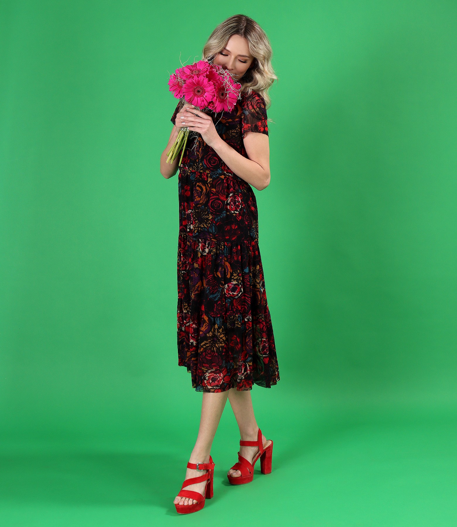 Rochie midi din tul elastic brocat cu catifea cu motive florale, cu volane si cu furou detasabil din saten elastic cu bretele reglabile, maneci scurte si decolteu rotund.