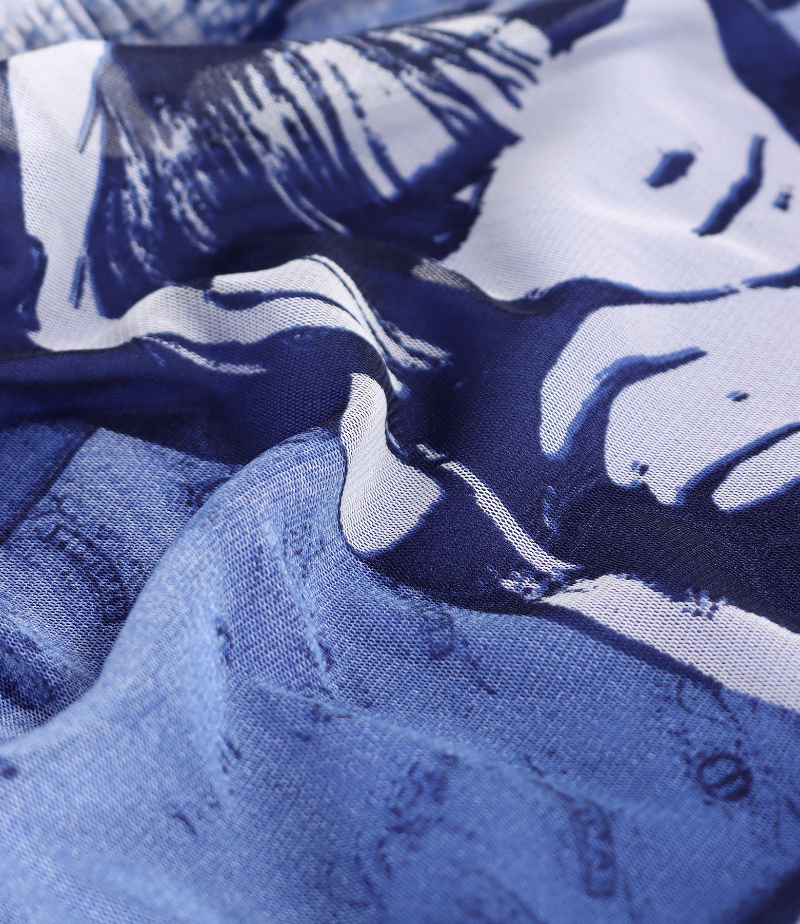 Rochie midi din tul elastic imprimat cu volane, cu furou detasabil din saten elastic cu bretele reglabile, maneci scurte si decolteu rotund.