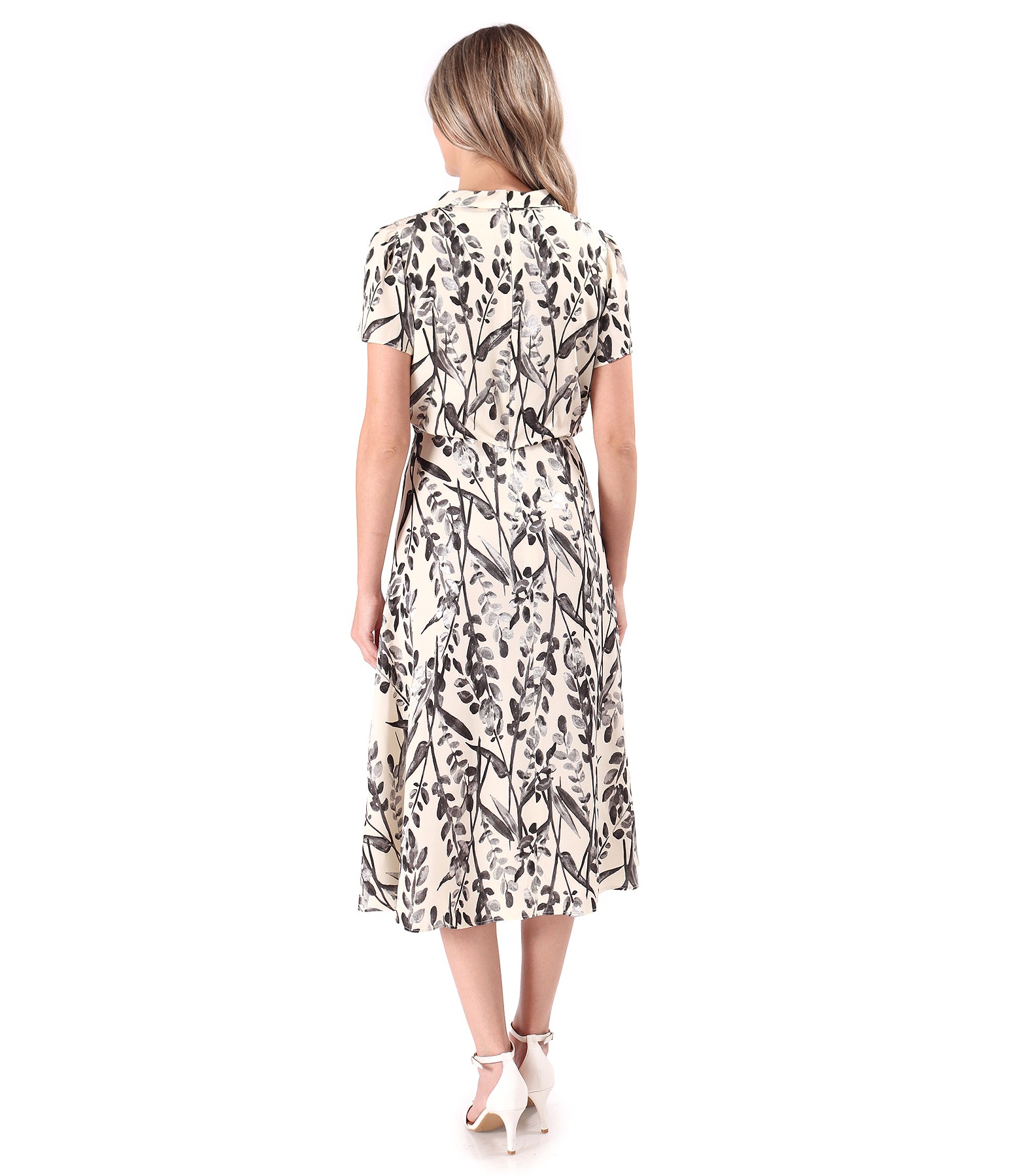 Rochie midi din viscoza cu motive florale si fir de effect, cu maneci scurte si guler rotund. Bustul este dublat cu viscoza. Se inchide cu fermoar ascuns pe mijloc spate.