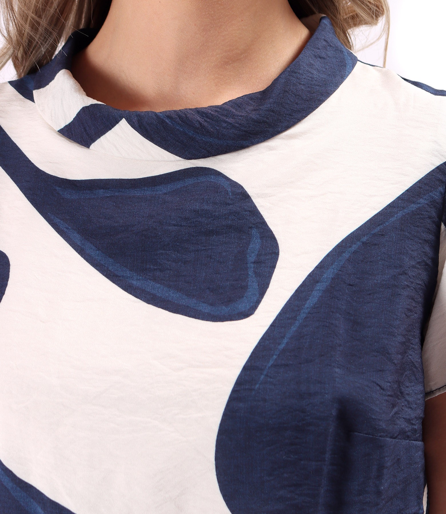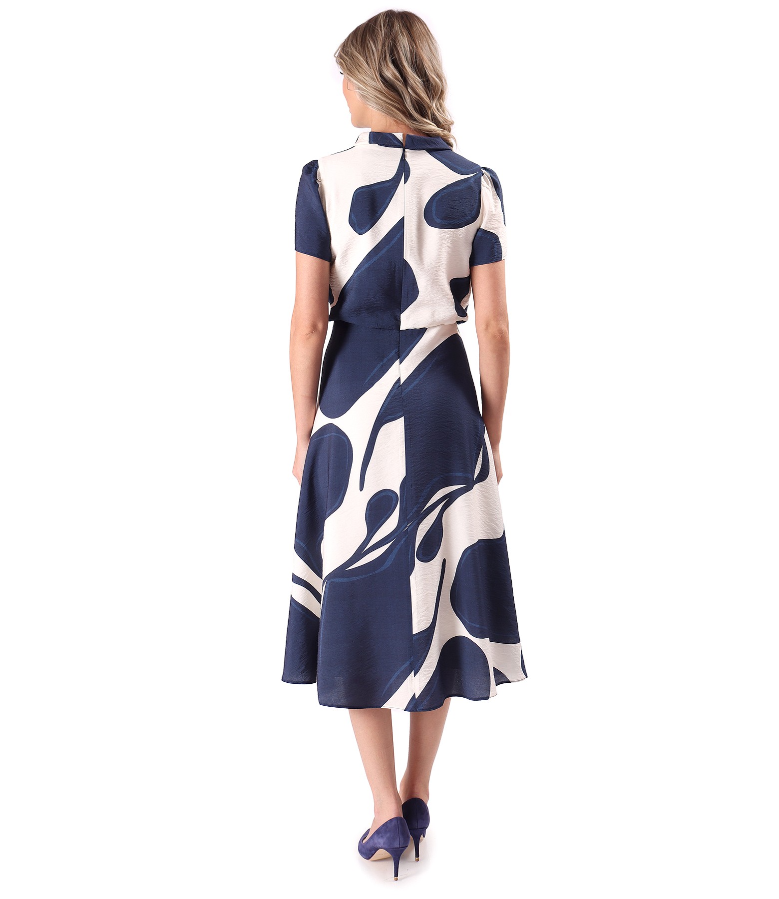 Rochie midi din viscoza usor creponata, imprimata digital cu motive florale, dublata cu viscoza, maneci scurte si guler rotund. Se inchide cu fermoar ascuns pe mijloc spate. Pozitia imprimeului variaza per produs.