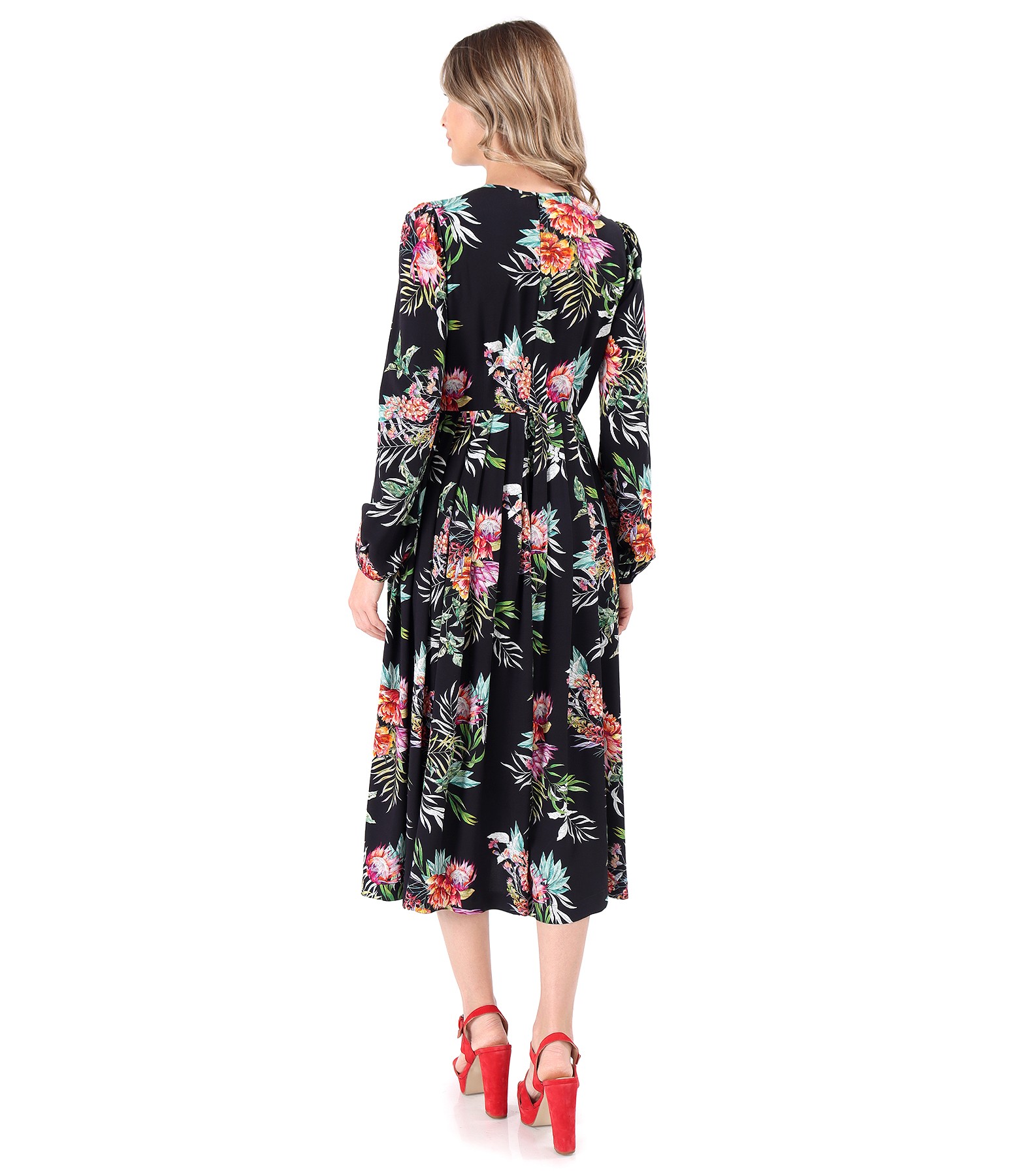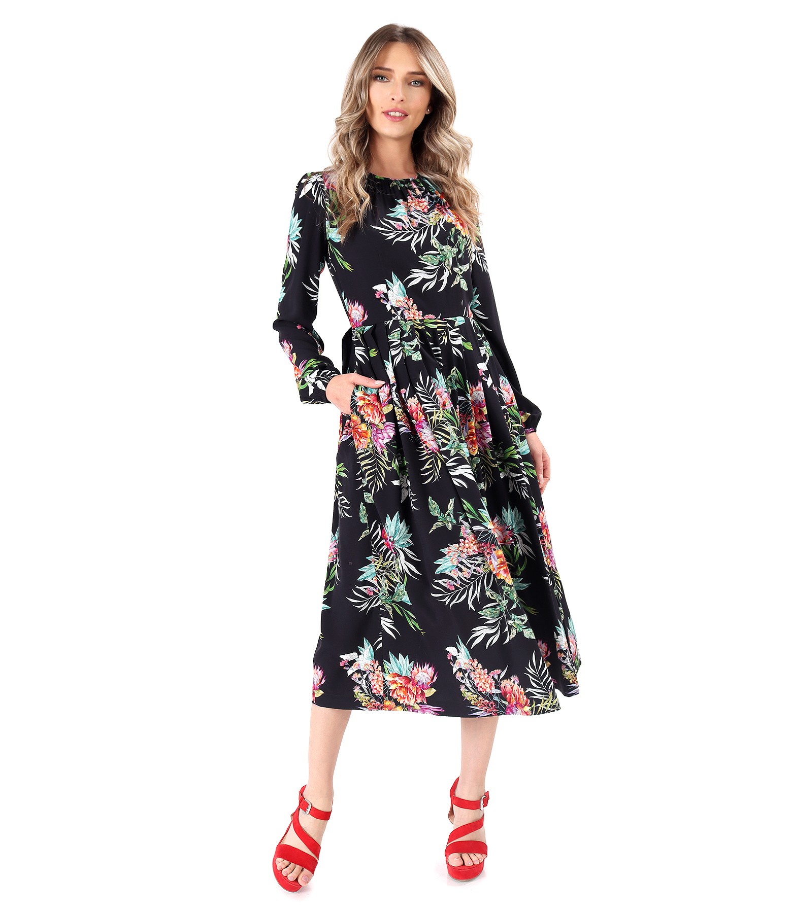 Rochie midi din viscoza imprimata cu motive florale, cu buzunare laterale, cu maneci lungi incretite la terminatie, decolteu rotund si cu pliuri pe fata si pe spate. Se inchide cu fermoar ascuns pe mijloc spate.