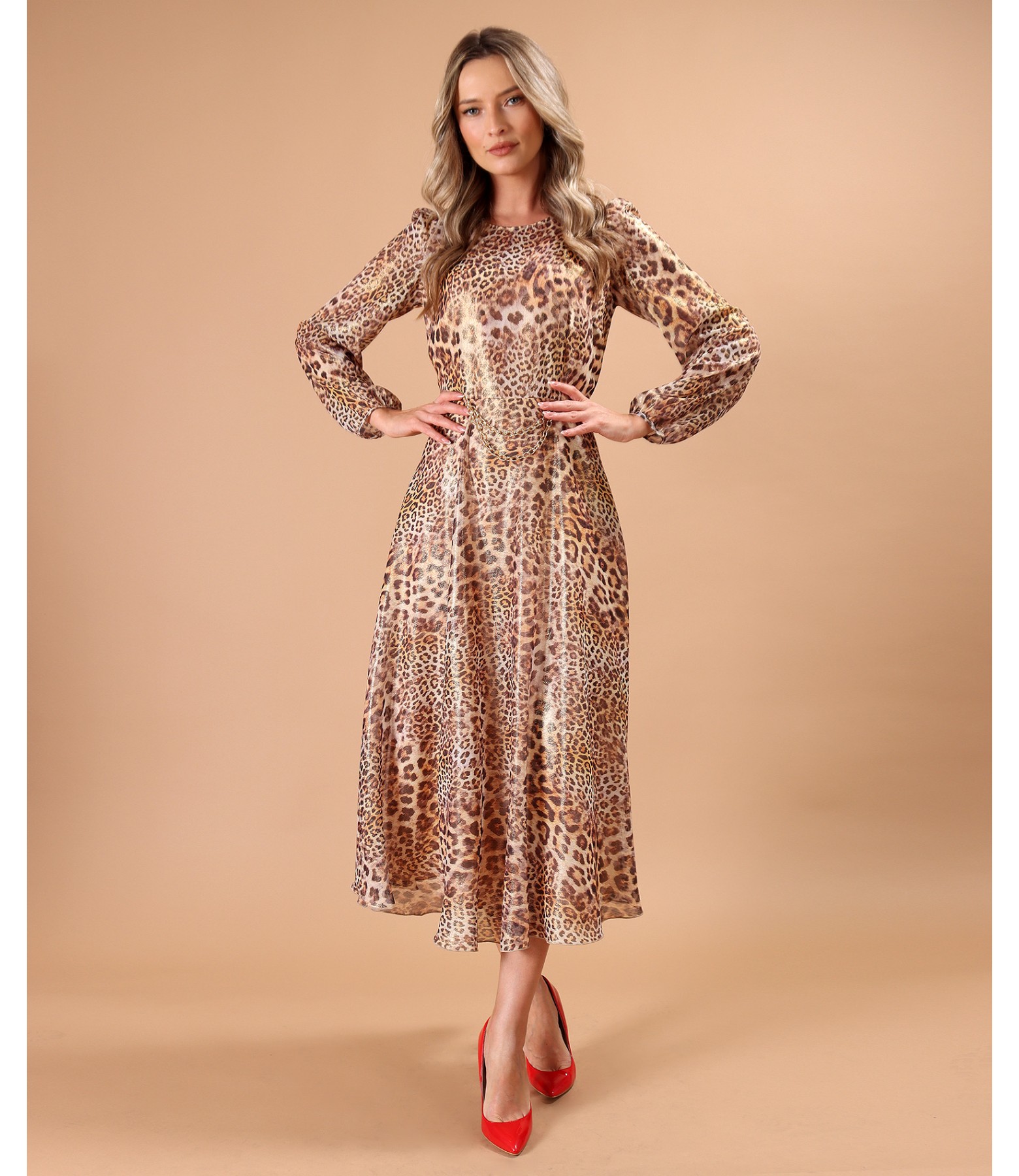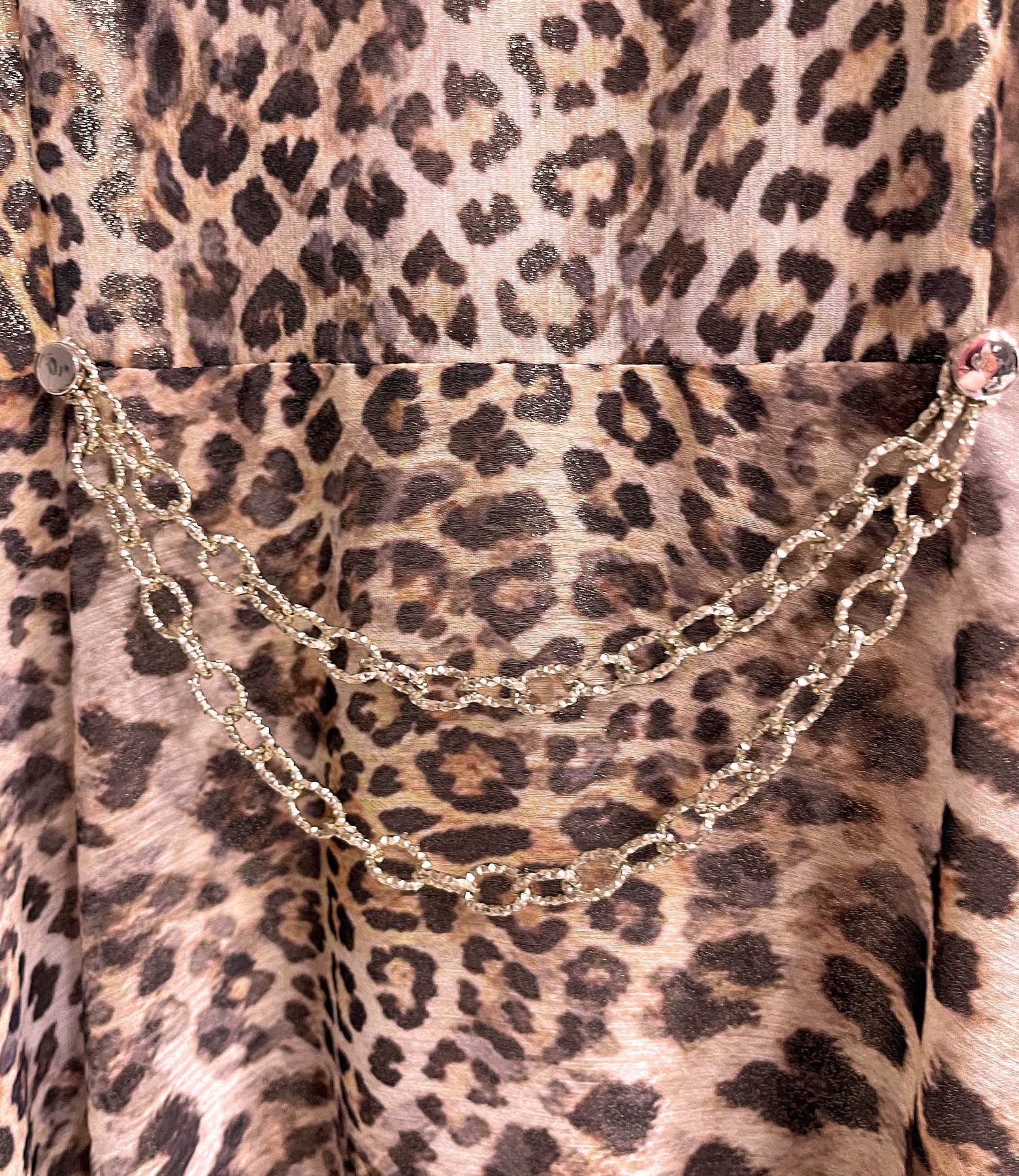 Rochie midi din voal cu animal print si fir de lurex, dublata cu viscoza, cu maneci lungi ample incretite la terminatie, decolteu rotund si lant decorativ auriu in talie. Se inchide cu fermoar ascuns pe mijloc spate.