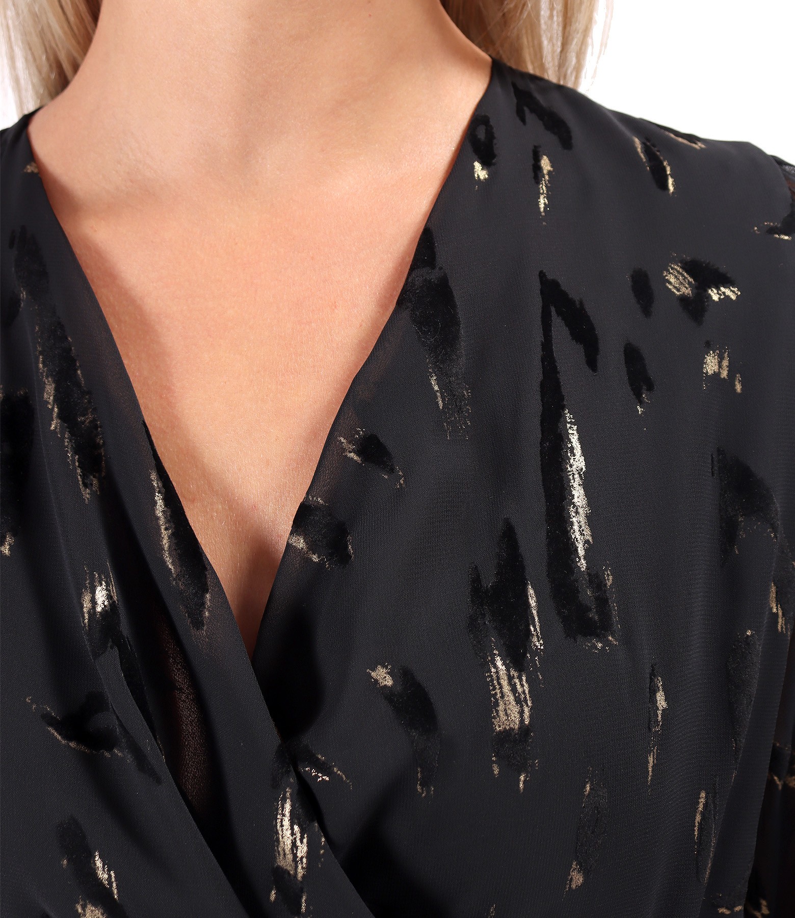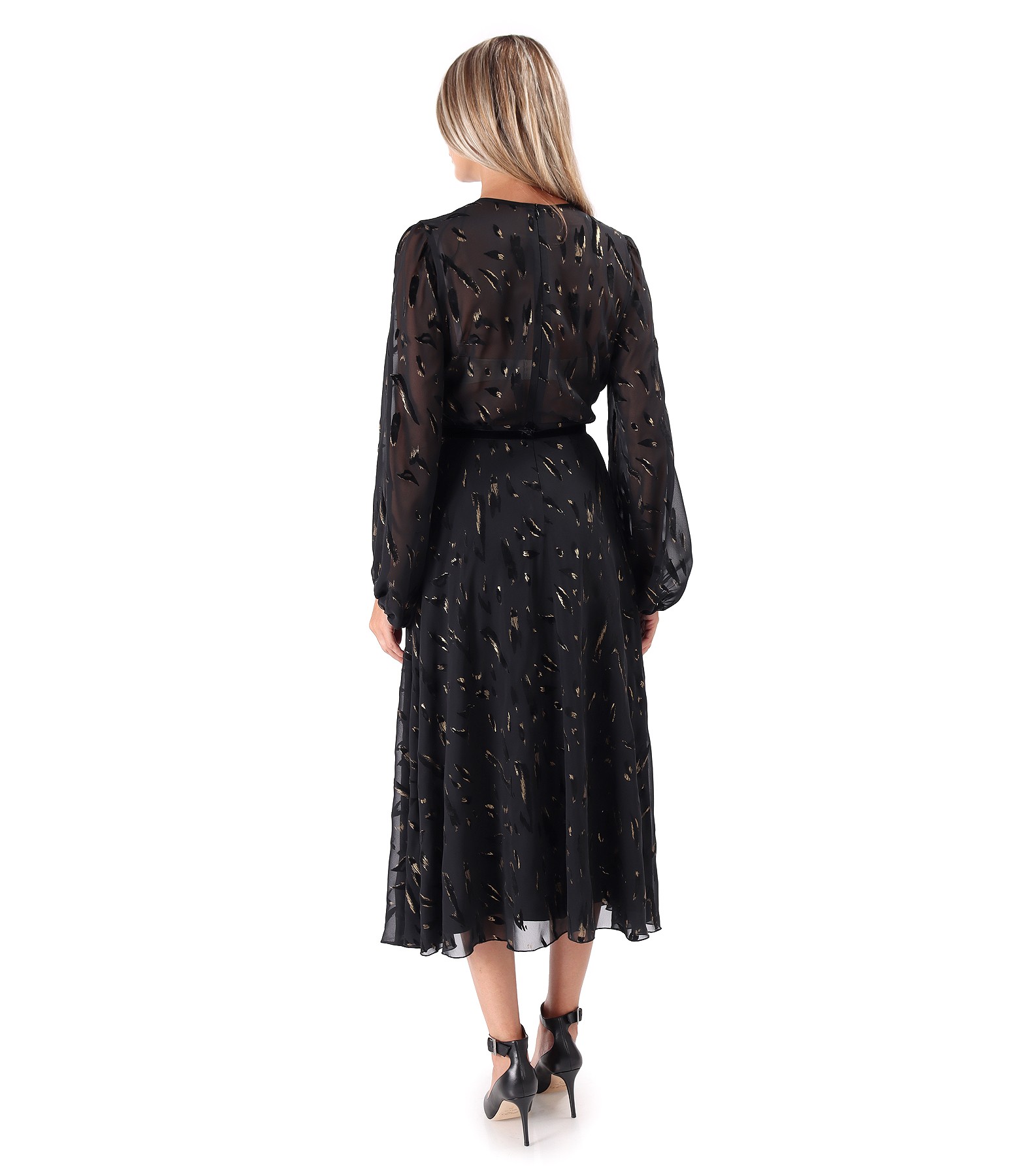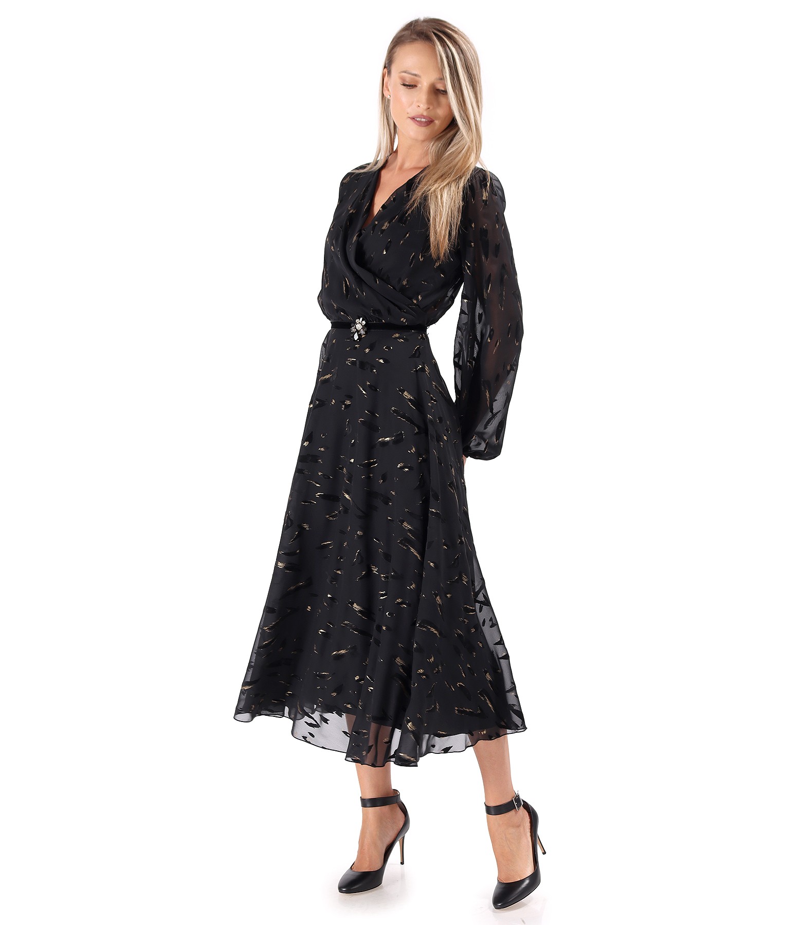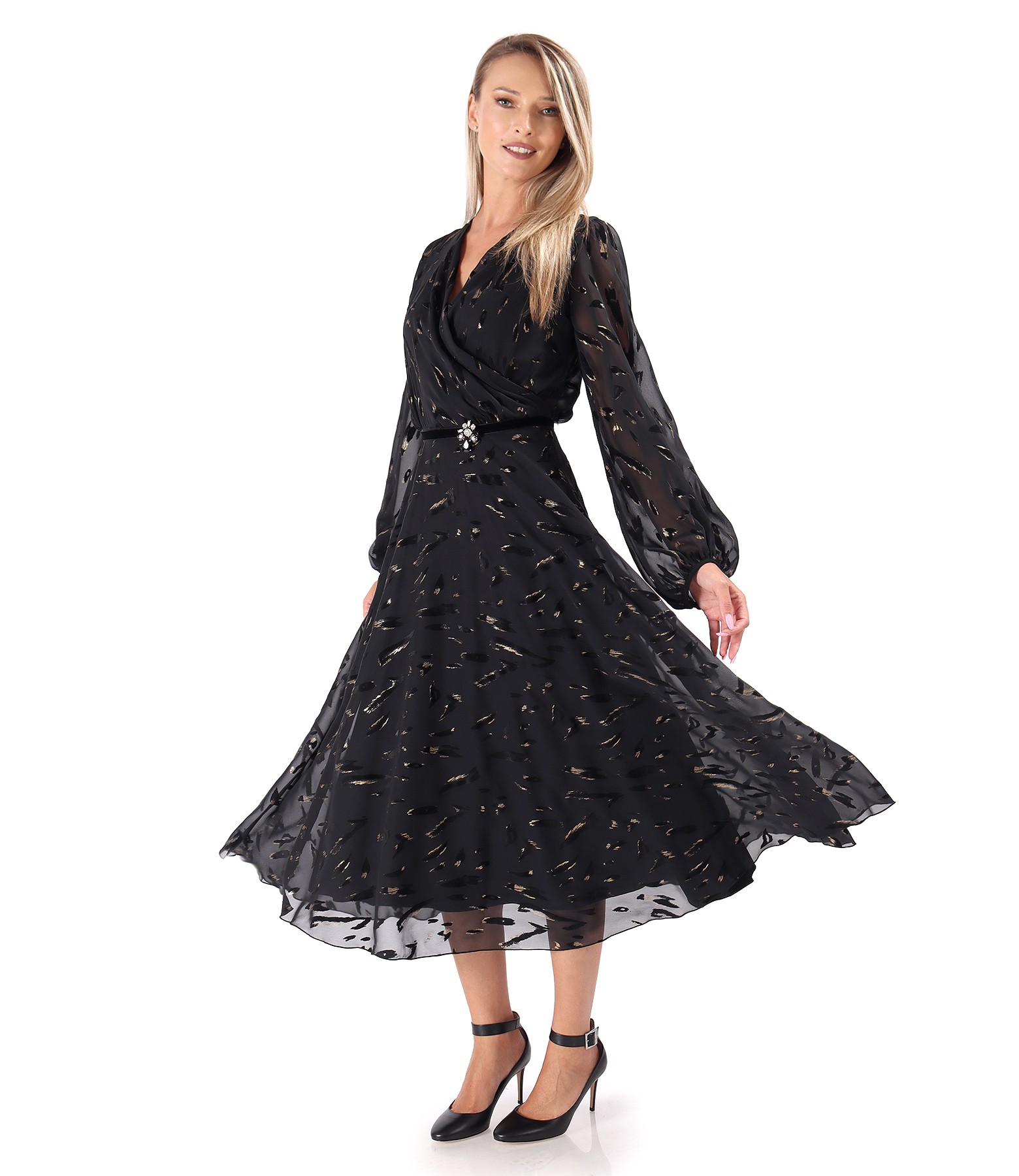 Rochie midi din voal cu motive de catifea in relief si motive aurii, cu cordon din catifea si brosa detasabila in talie, dublata cu viscoza, cu pieptii petrecuti, maneci lungi ample, incretite la terminatie. Se inchide cu fermoar ascuns pe mijloc spate.