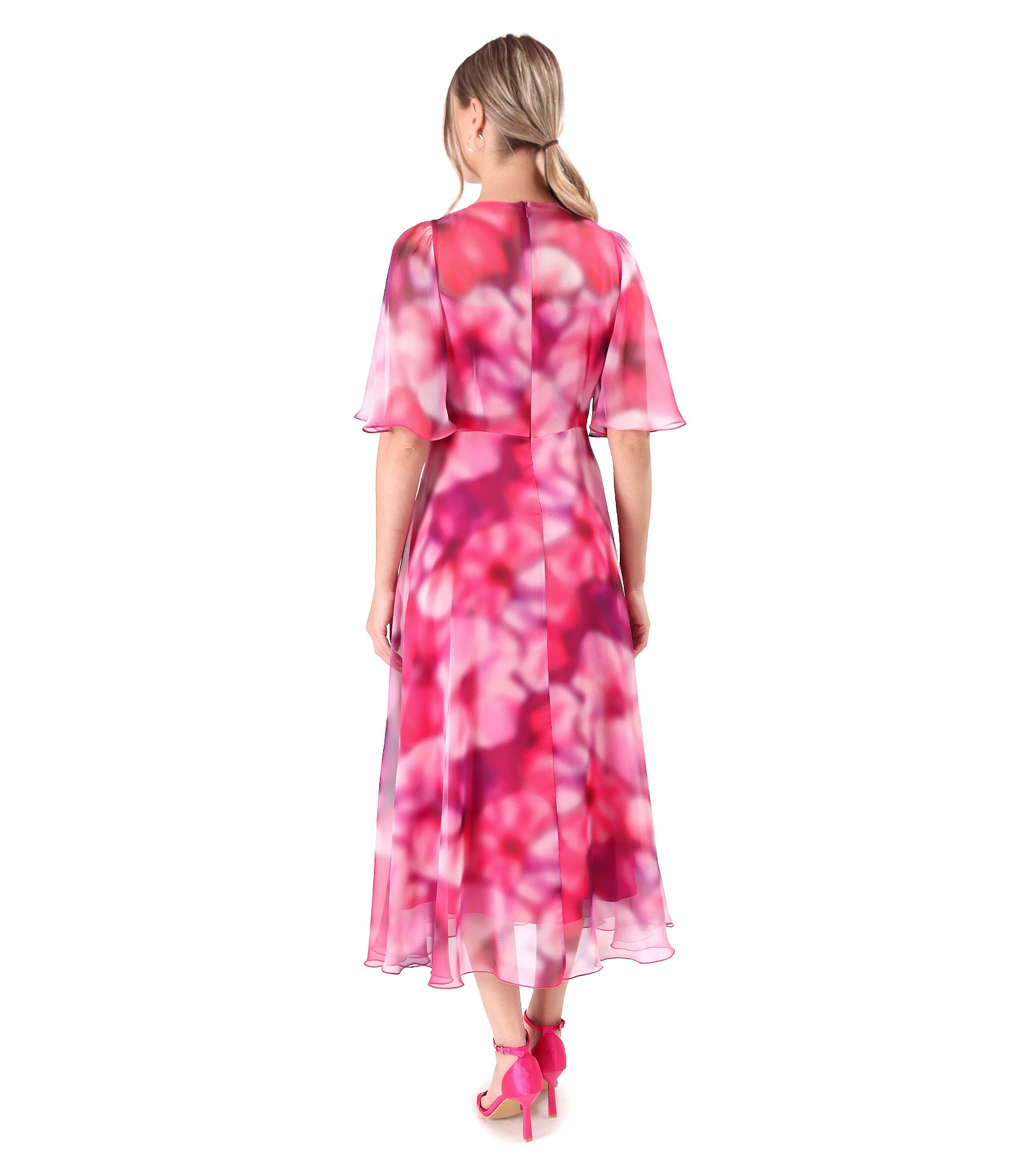 Rochie midi din voal fin imprimat cu motive florale, cu maneci ample din voal, dublata cu viscoza, si cu decolteu rotund. Se inchide cu fermoar ascuns pe mijloc spate. Pozitia imprimeului variaza per produs.