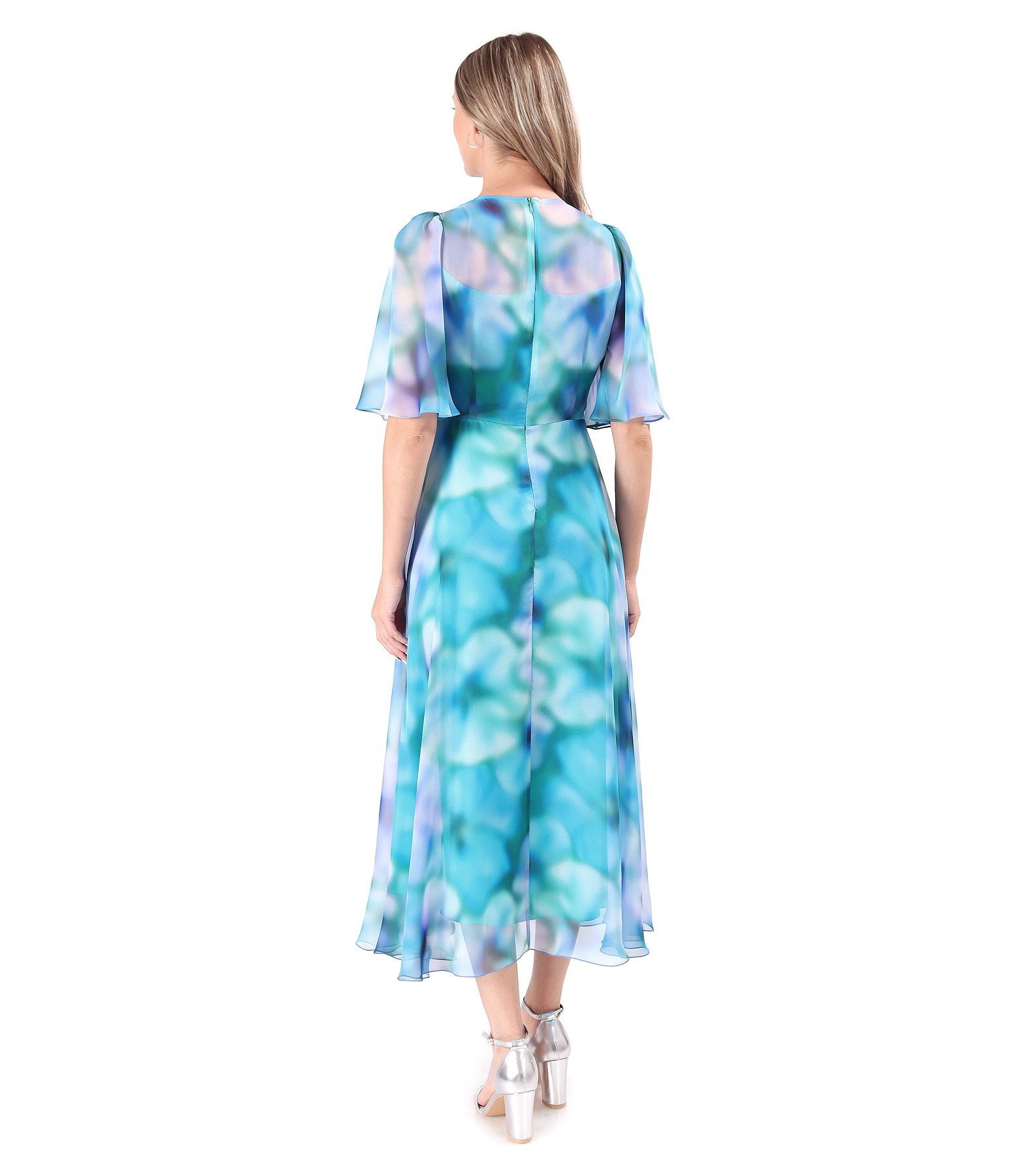 Rochie midi din voal fin imprimat cu motive florale, cu maneci ample din voal, dublata cu viscoza, si cu decolteu rotund. Se inchide cu fermoar ascuns pe mijloc spate. Pozitia imprimeului variaza per produs.