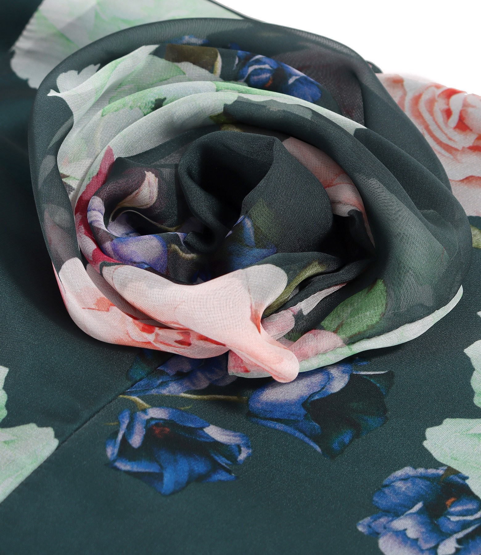 Rochie midi din voal fin imprimat digital cu motive florale, cu maneci ample din voal, dublata cu viscoza, si cu decolteu rotund cu floare detasabila executata manual. Se inchide cu fermoar ascuns pe mijloc spate. Pozitia imprimeului variaza per produs.