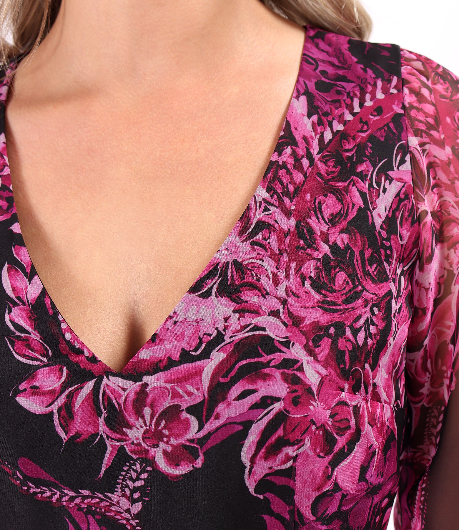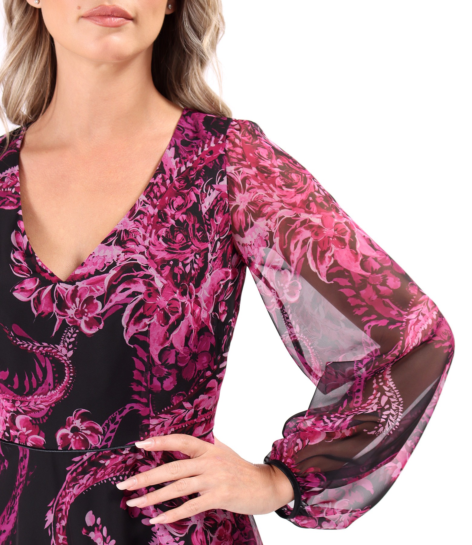 Rochie midi din voal fin imprimat digital cu motive paisley, dublata cu viscoza, cu maneci lungi ample incretite la terminatie si cu decolteu in V. Se inchide cu fermoar ascuns pe mijloc spate. Pozitia imprimeului variaza per produs.
