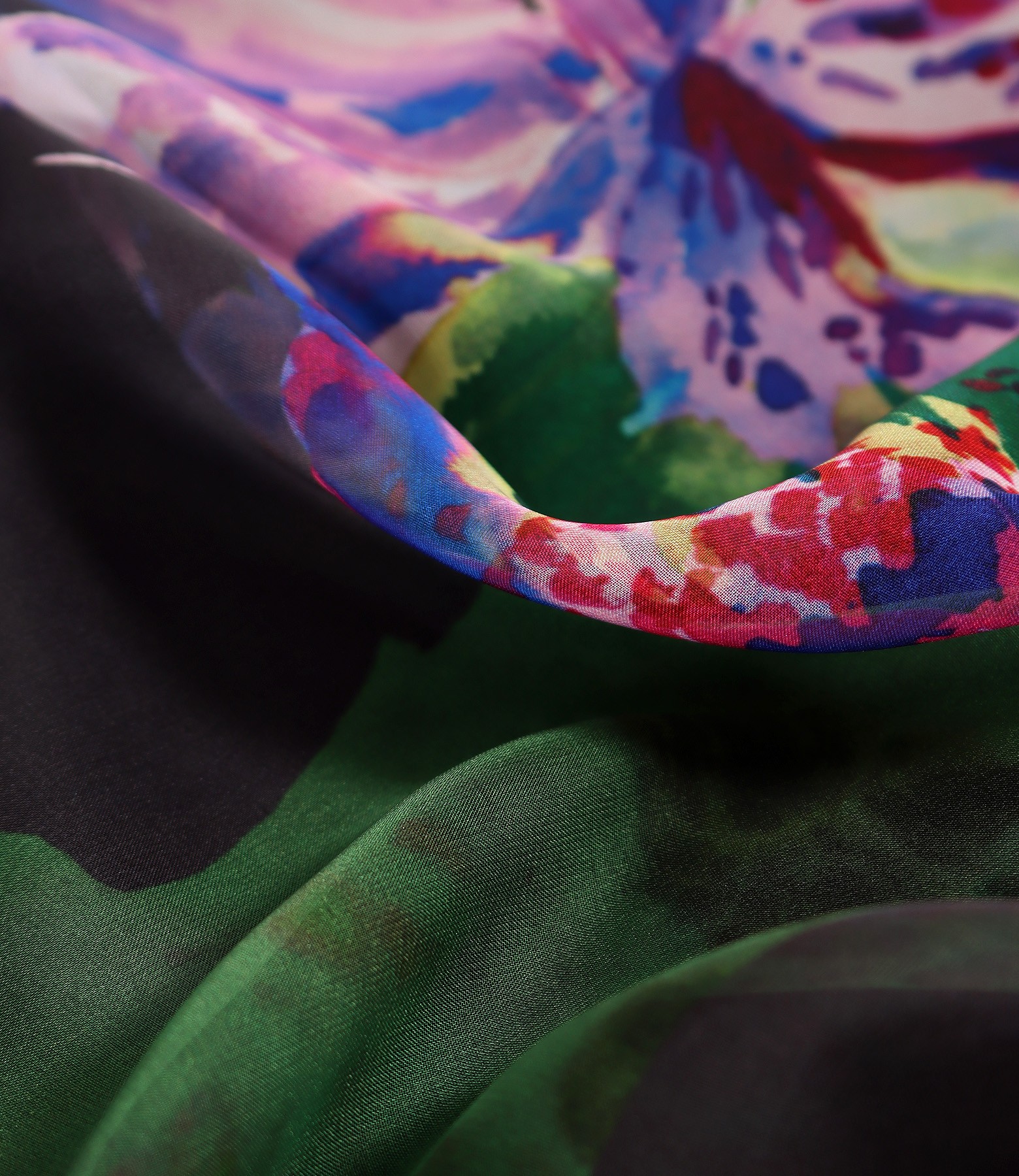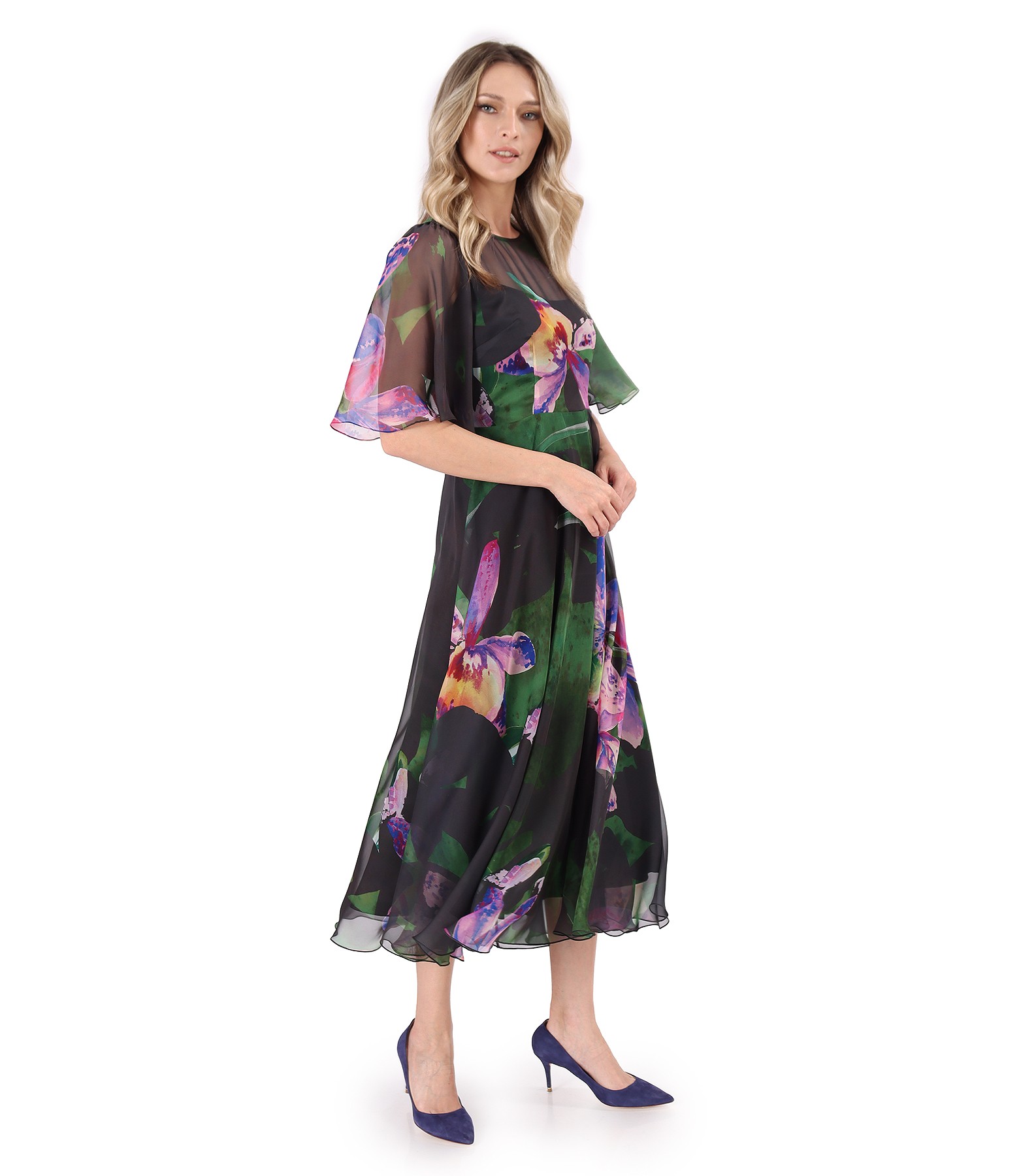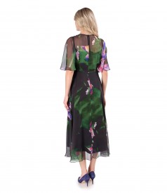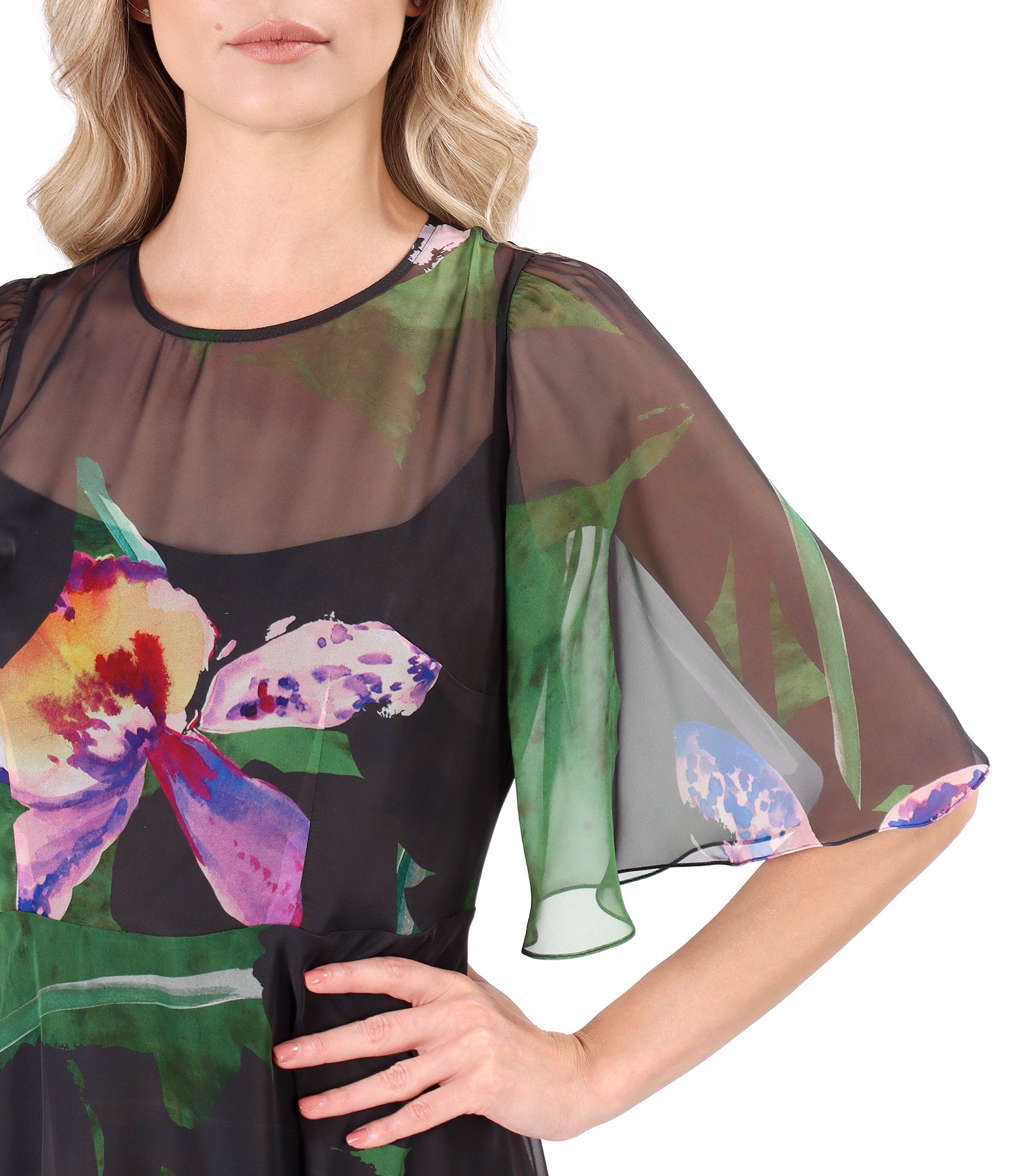 Rochie midi din voal imprimat cu motive florale, cu maneci ample din voal, dublata cu viscoza, si cu decolteu rotund. Se inchide cu fermoar ascuns pe mijloc spate. Pozitia imprimeului variaza per produs.