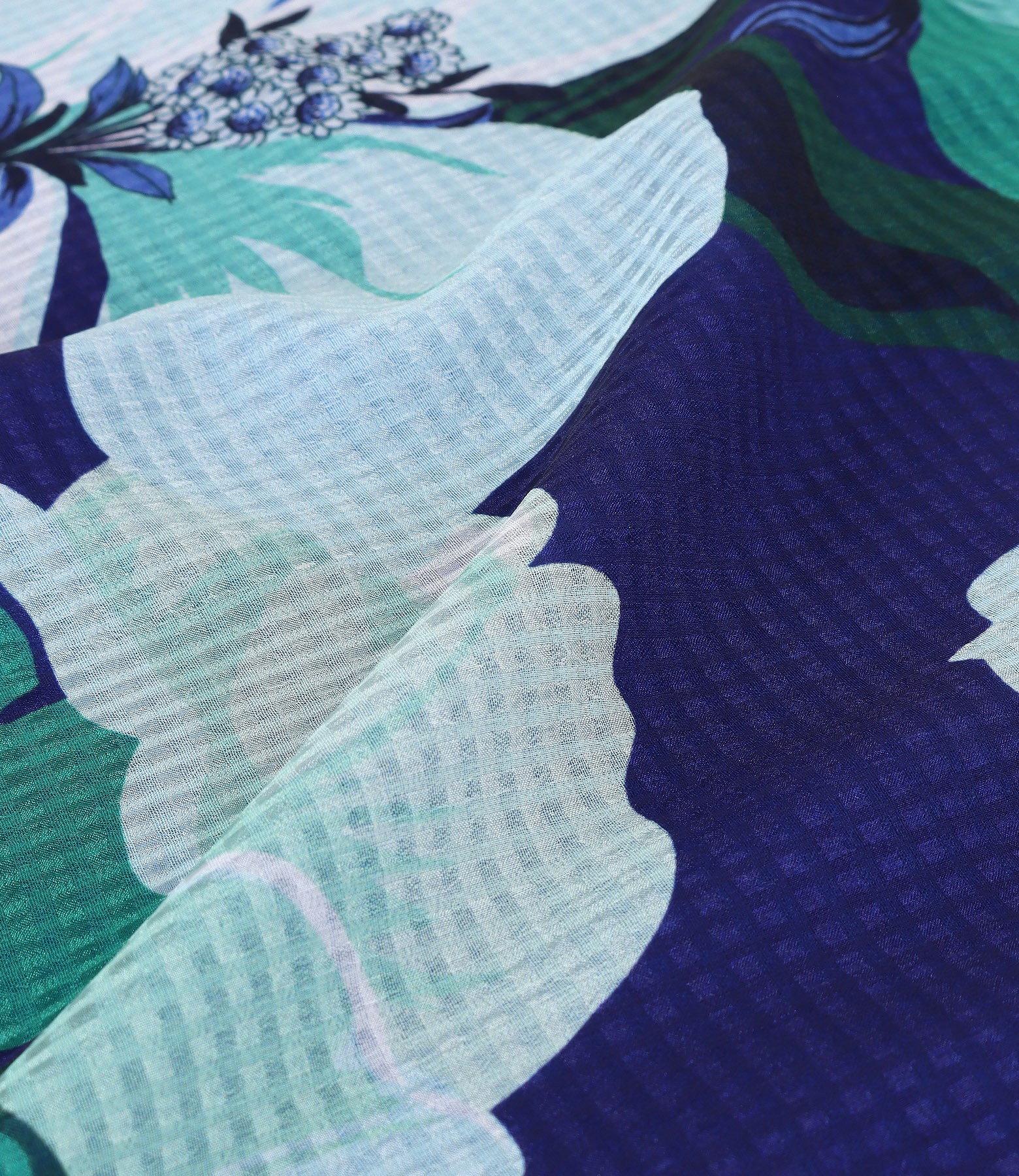 Rochie midi din voal imprimat cu motive florale, dublata cu viscoza, cu maneci lungi si decolteu rotund. Se inchide cu un nasture si cu fermoar pe mijloc spate. Pozitia imprimeului variaza per produs.