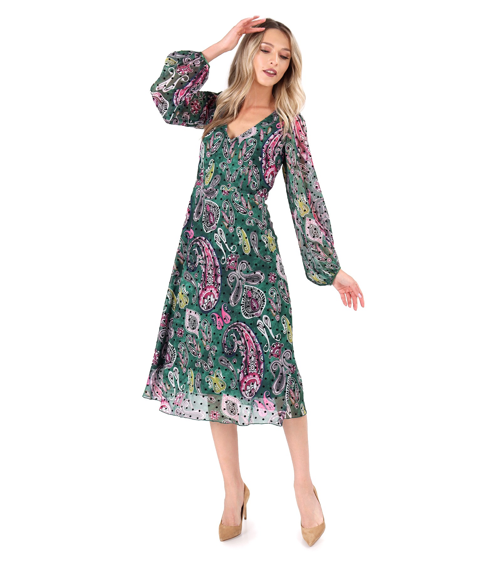 Rochie midi din voal imprimat cu motive paisley si cu picouri din catifea (Verde), marimea