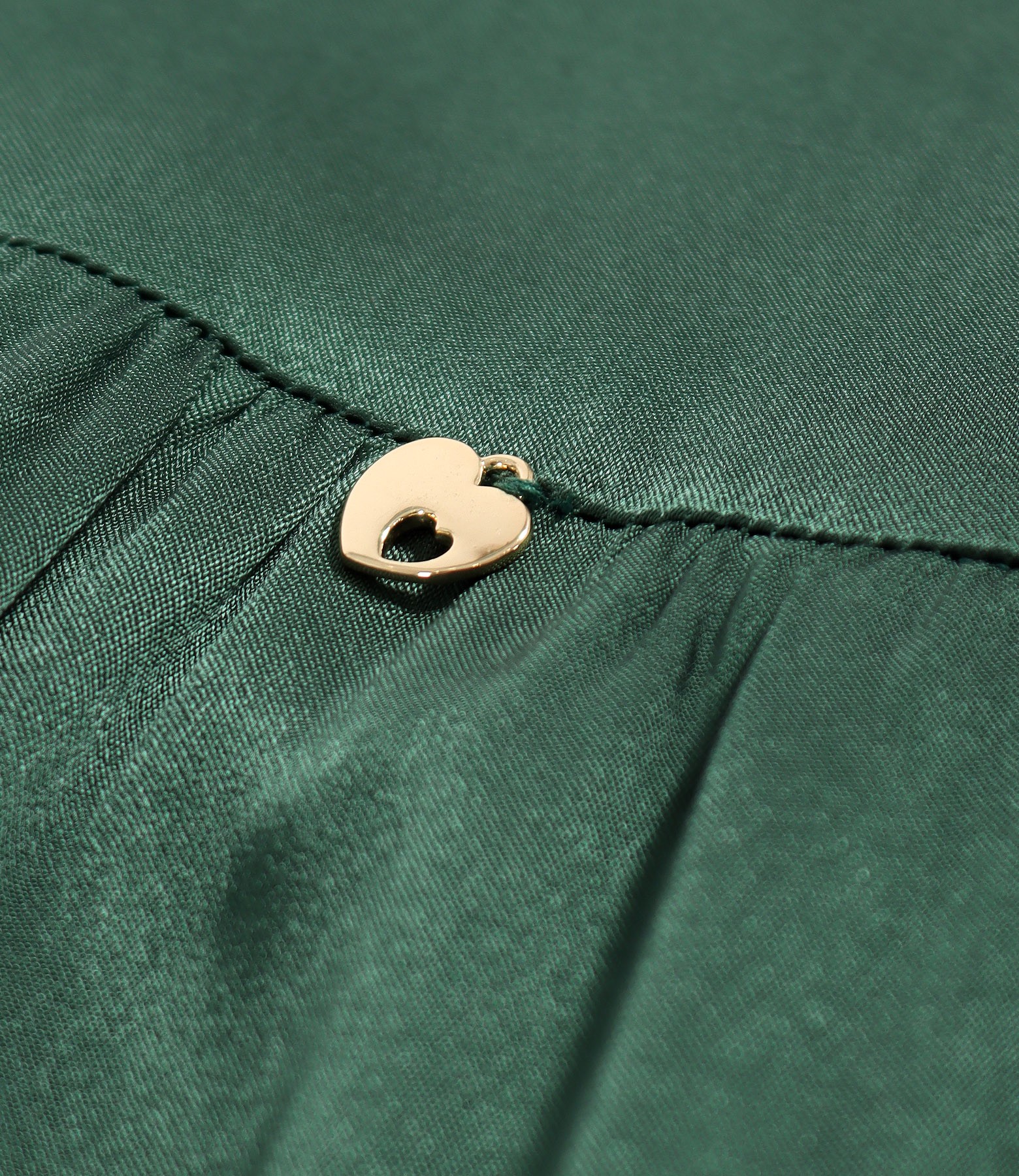 Rochie midi eleganta cu volane din satin de viscoza, cu decolteu in V, maneci 3/4, buzunare laterale si cu inima metalica decorativa in talie.