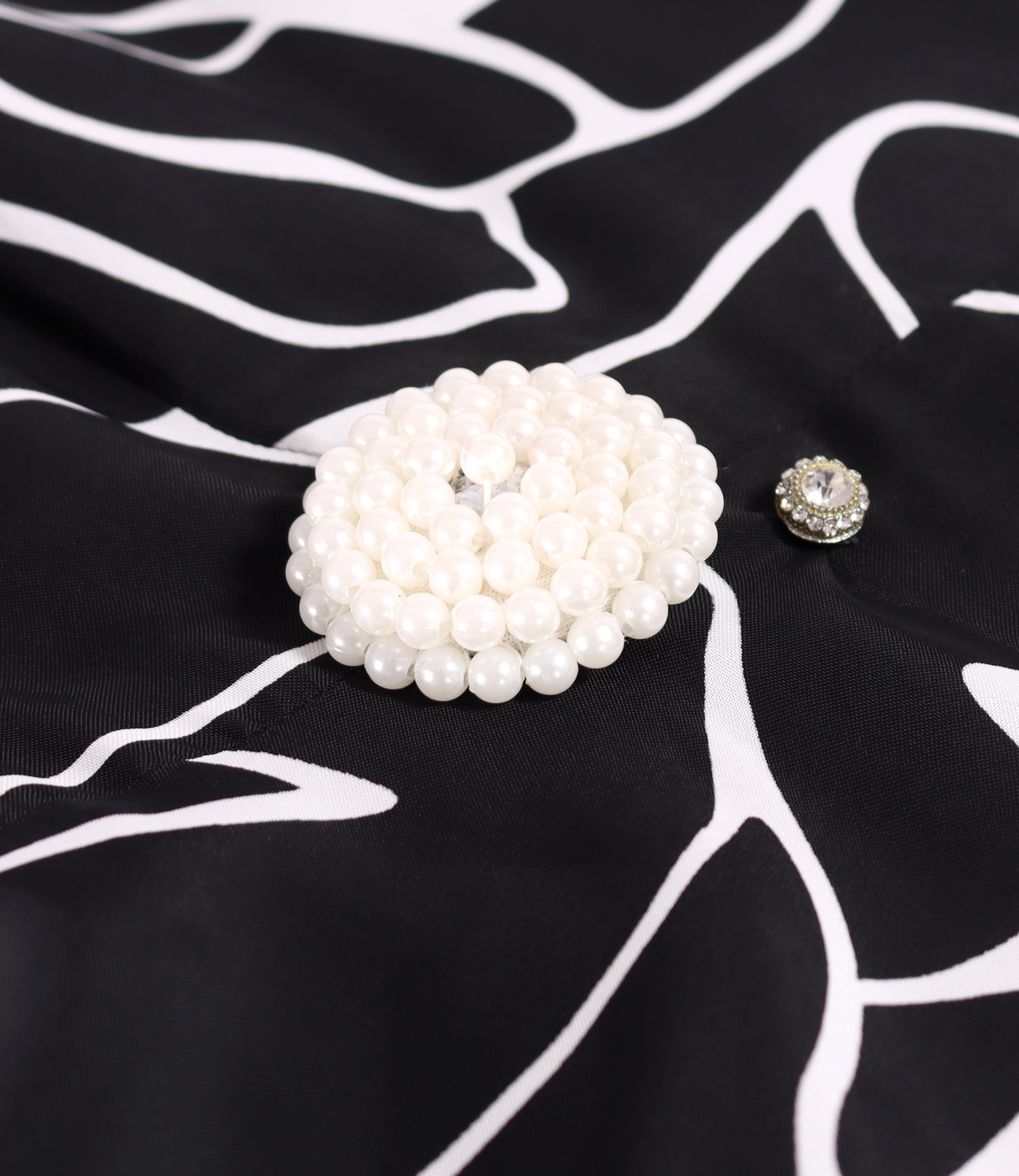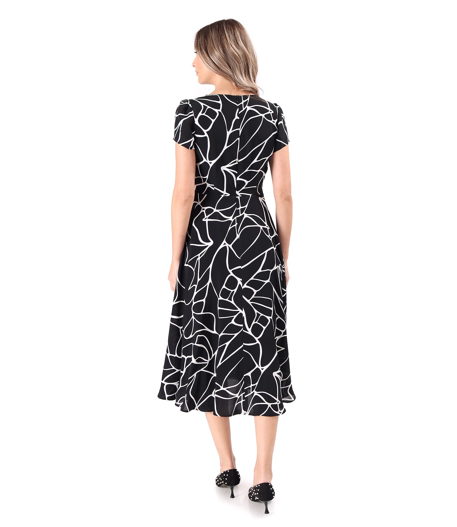 Rochie midi eleganta din viscoza imprimata cu motive geometrice, dublata cu viscoza, cu decolteu rotund, maneci scurte si brosa cu perle cusuta in talie. Se inchide cu fermoar ascuns pe mijloc spate.