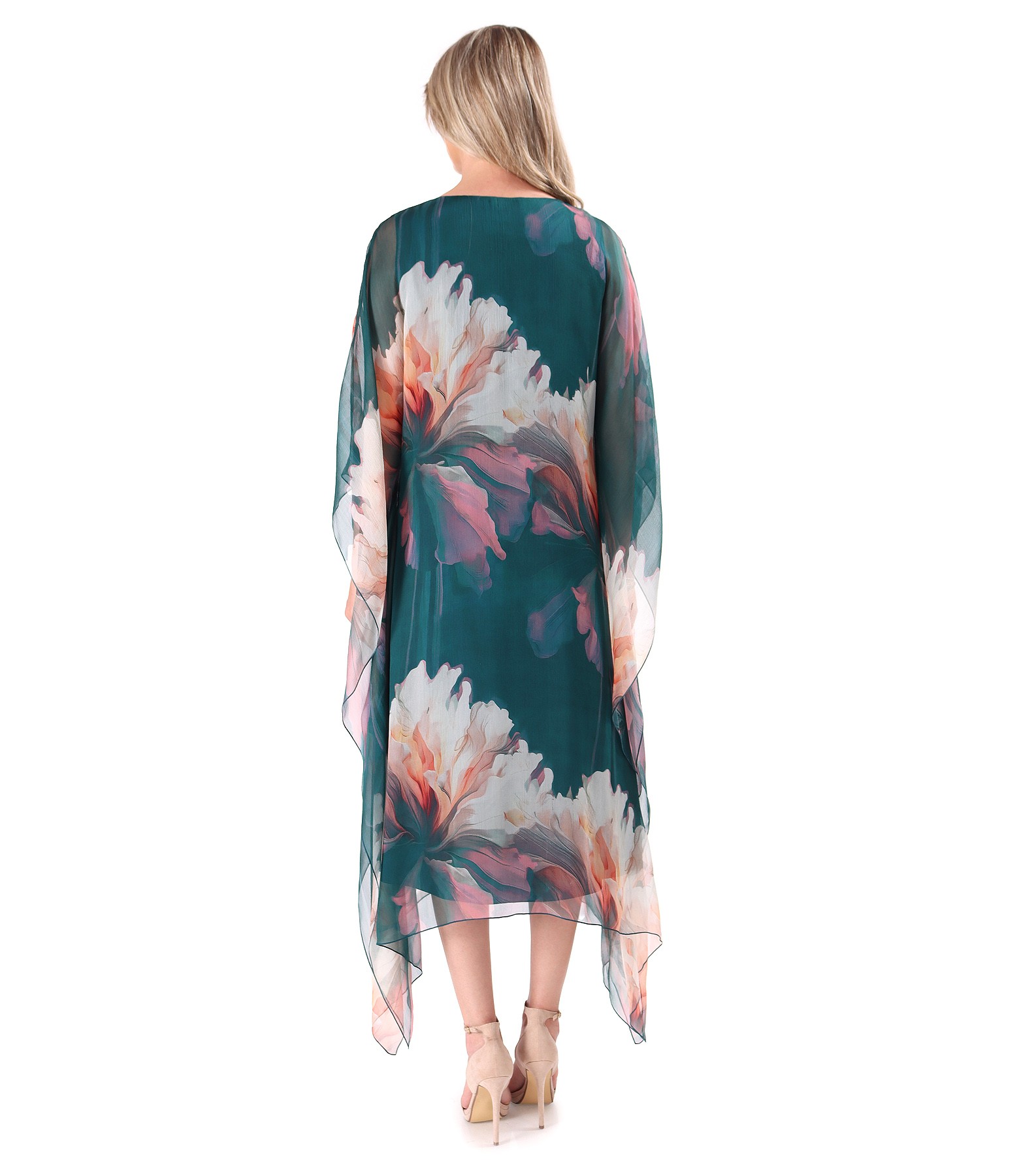 Rochie midi fluture din voal de matase naturala imprimata cu motive florale (Verde Smarald), marimea