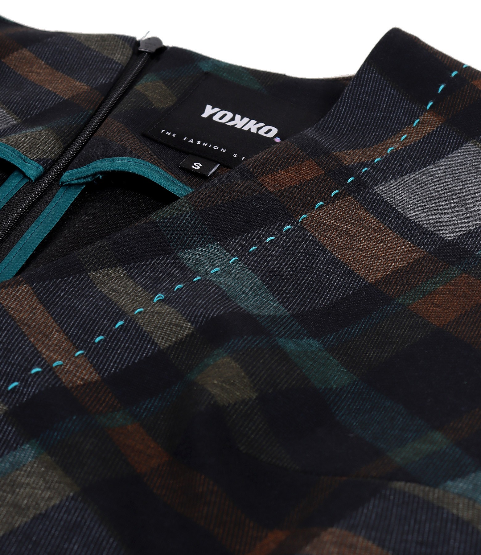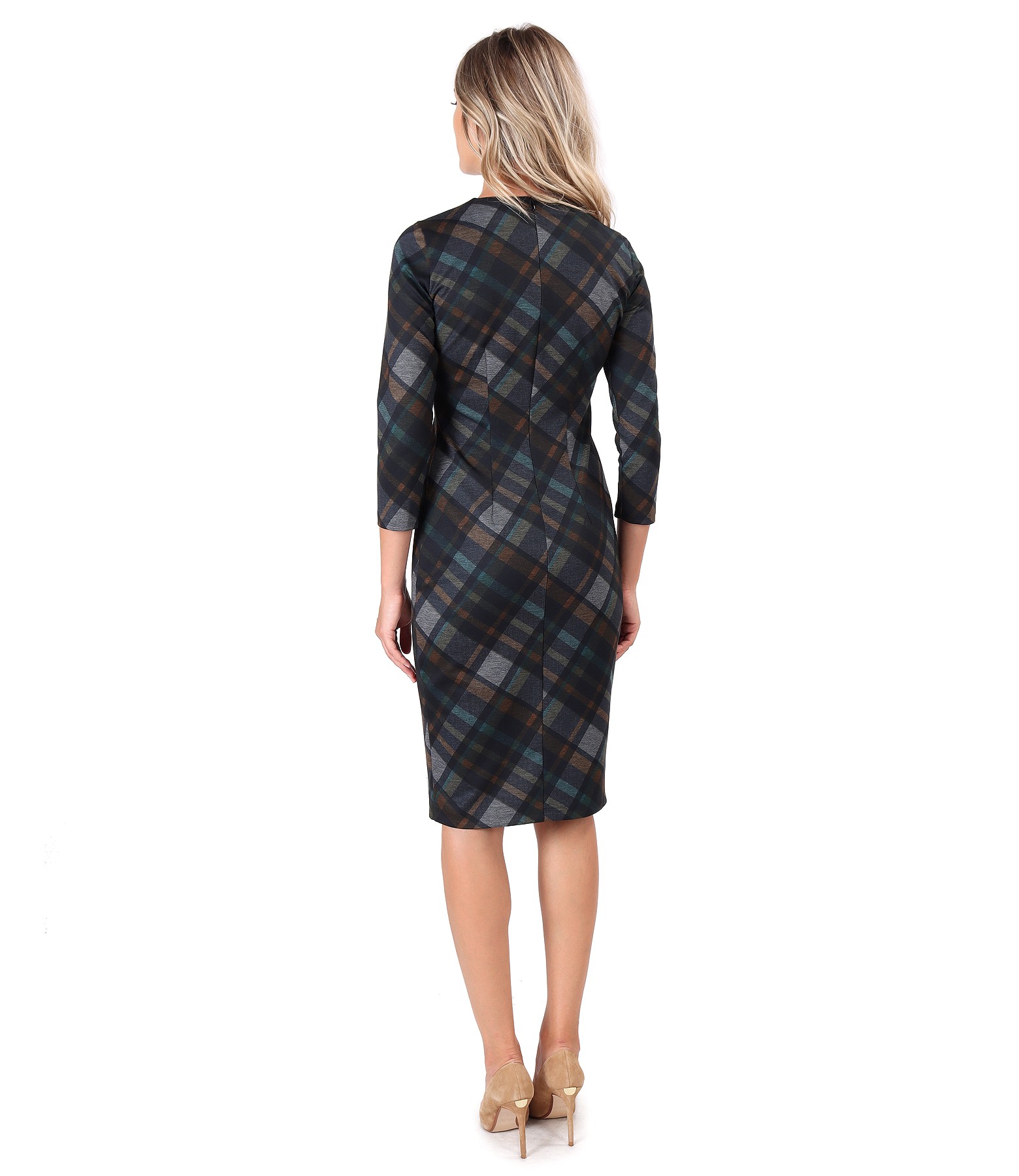 Rochie midi din jerse elastic gros in carouri, necaptusita, cu maneci 3/4 si decolteu in V si cusatura contrast la decolteu. Se inchide cu fermoar ascuns pe mijloc spate.