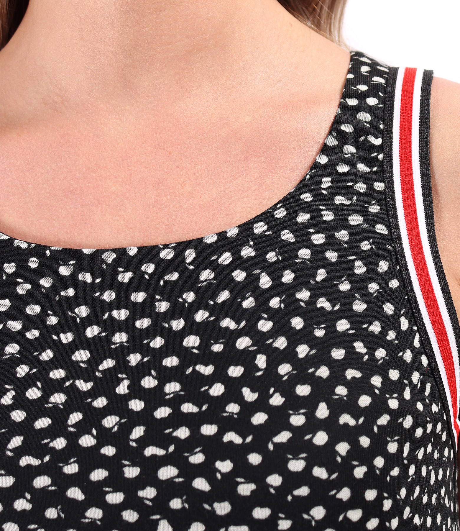 Rochie midi lejera din jerse imprimat, dublata cu viscoza fina, cu garnituri decorative si cu decolteu rotund.