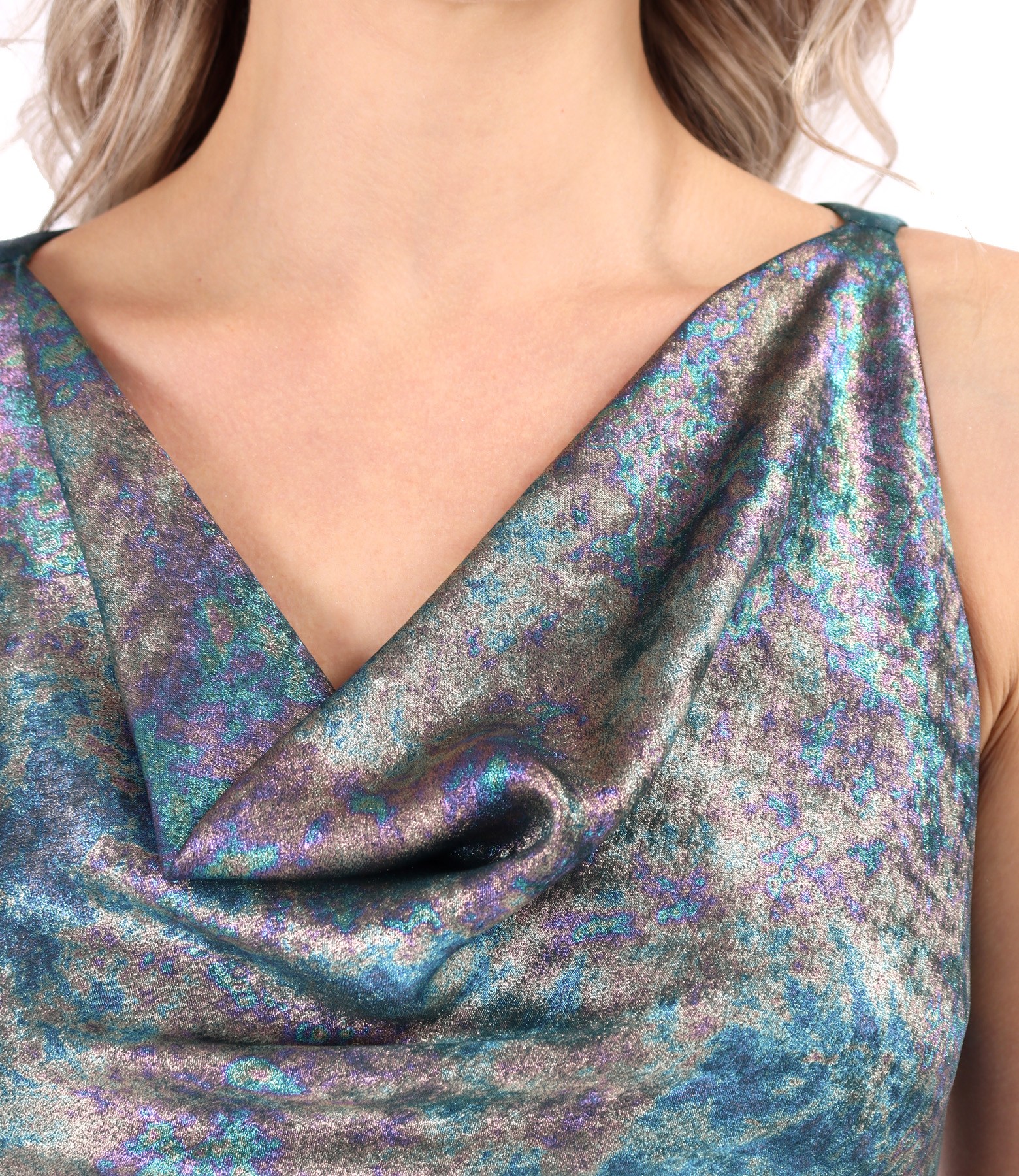 Rochie midi pe bie din crep cu efect sidefat cu decolteu in falduri, dublata cu viscoza, fara maneci. Nu are sistem de inchidere.