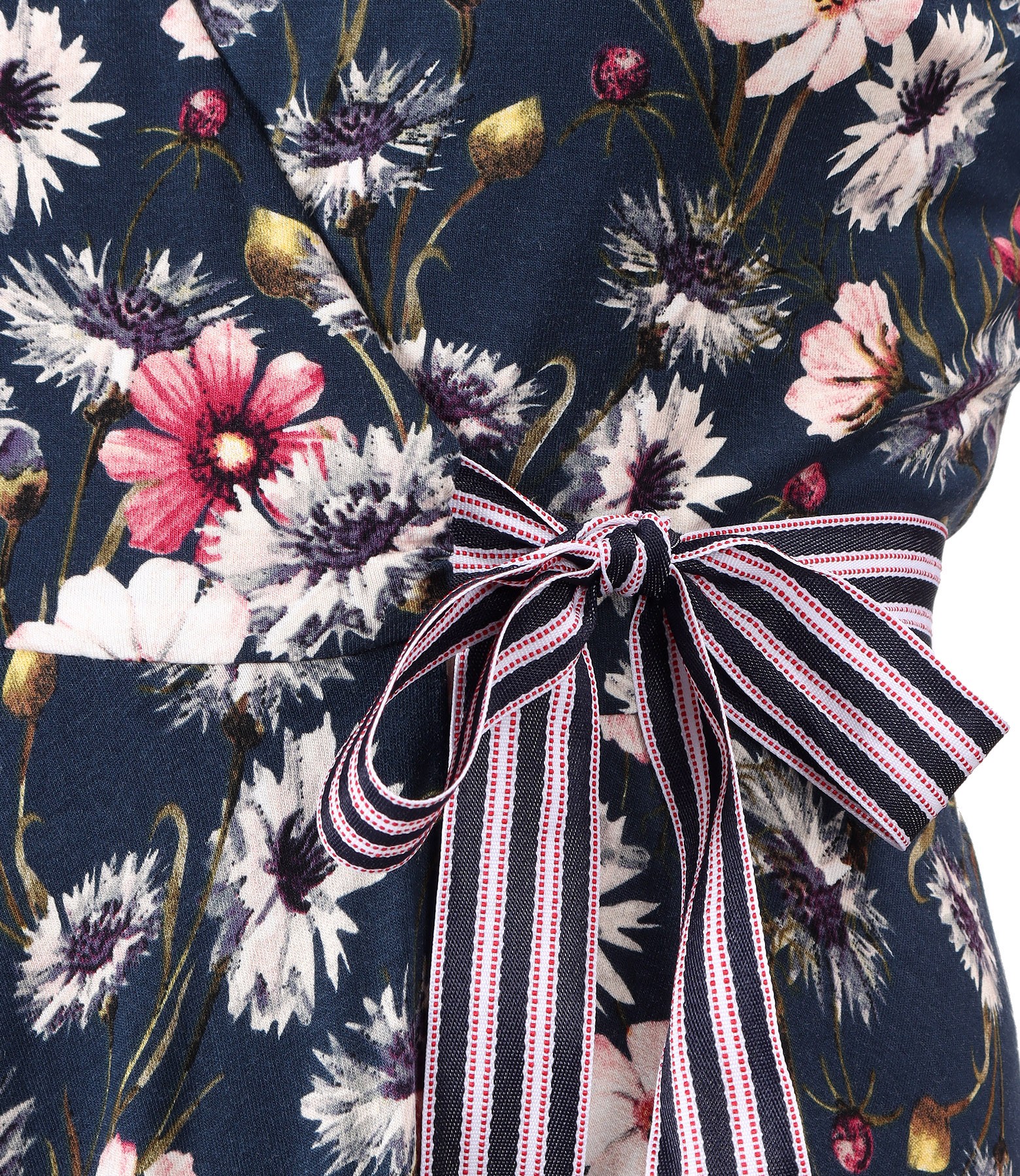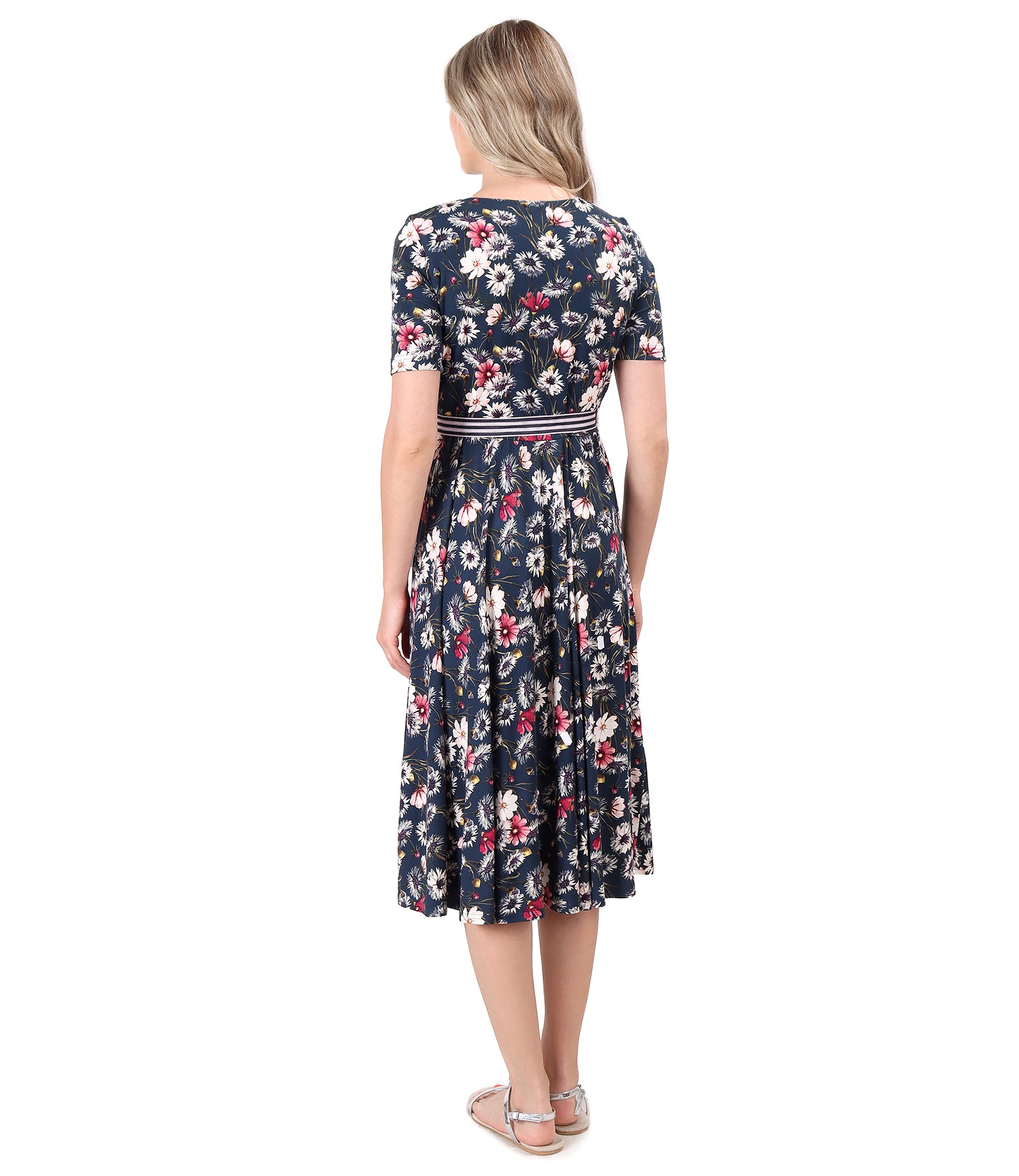 Rochie midi petrecuta, din jerse elastic imprimat cu motive florale, dublata in partea de sus cu jerse elastic, cu maneci scurte. Se inchide cu un cordon din rips in talie.