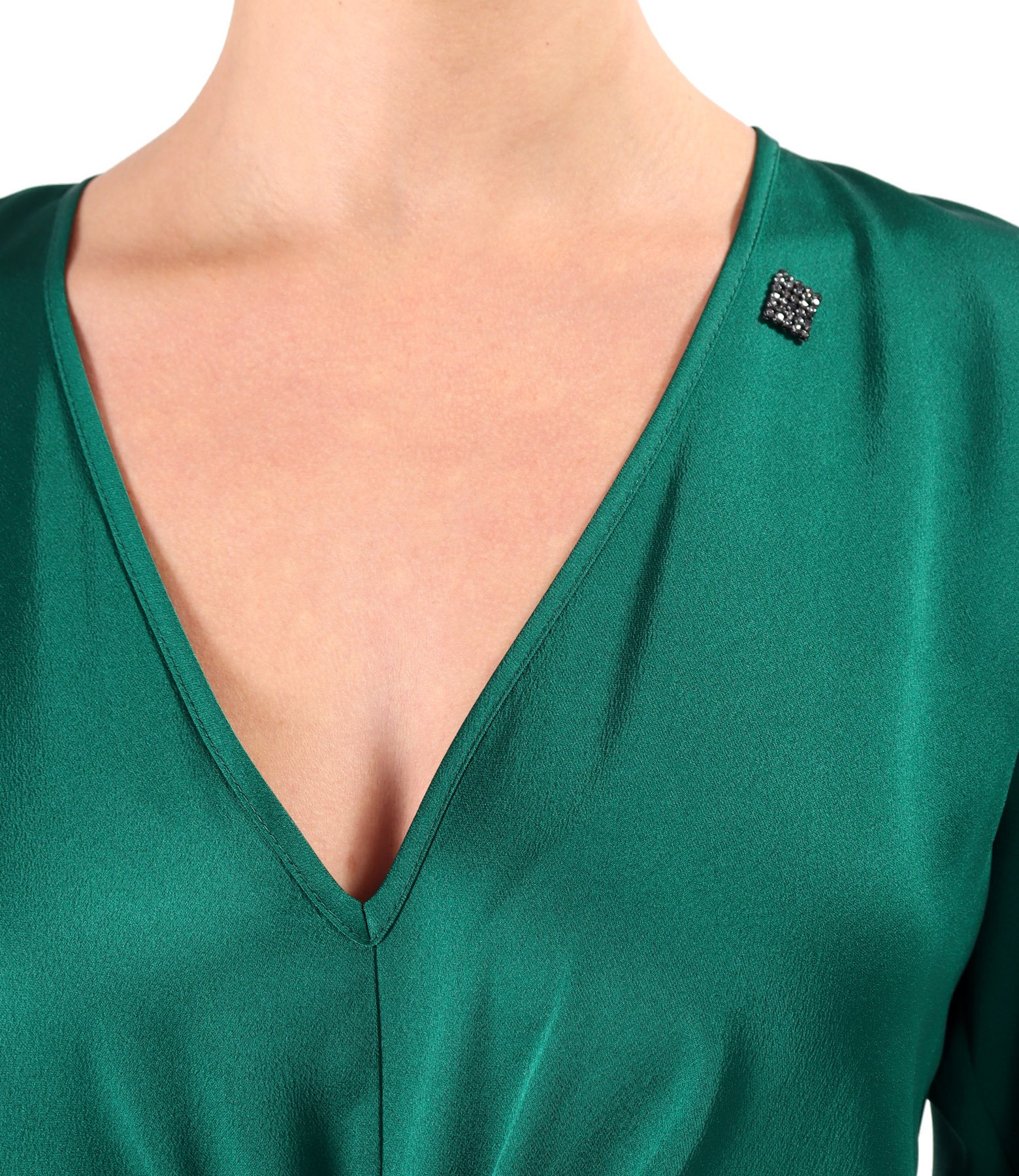 Rochie midi satinata cu cordon rasucit in talie, cu maneci semi-lungi evazate si decolteu in V.