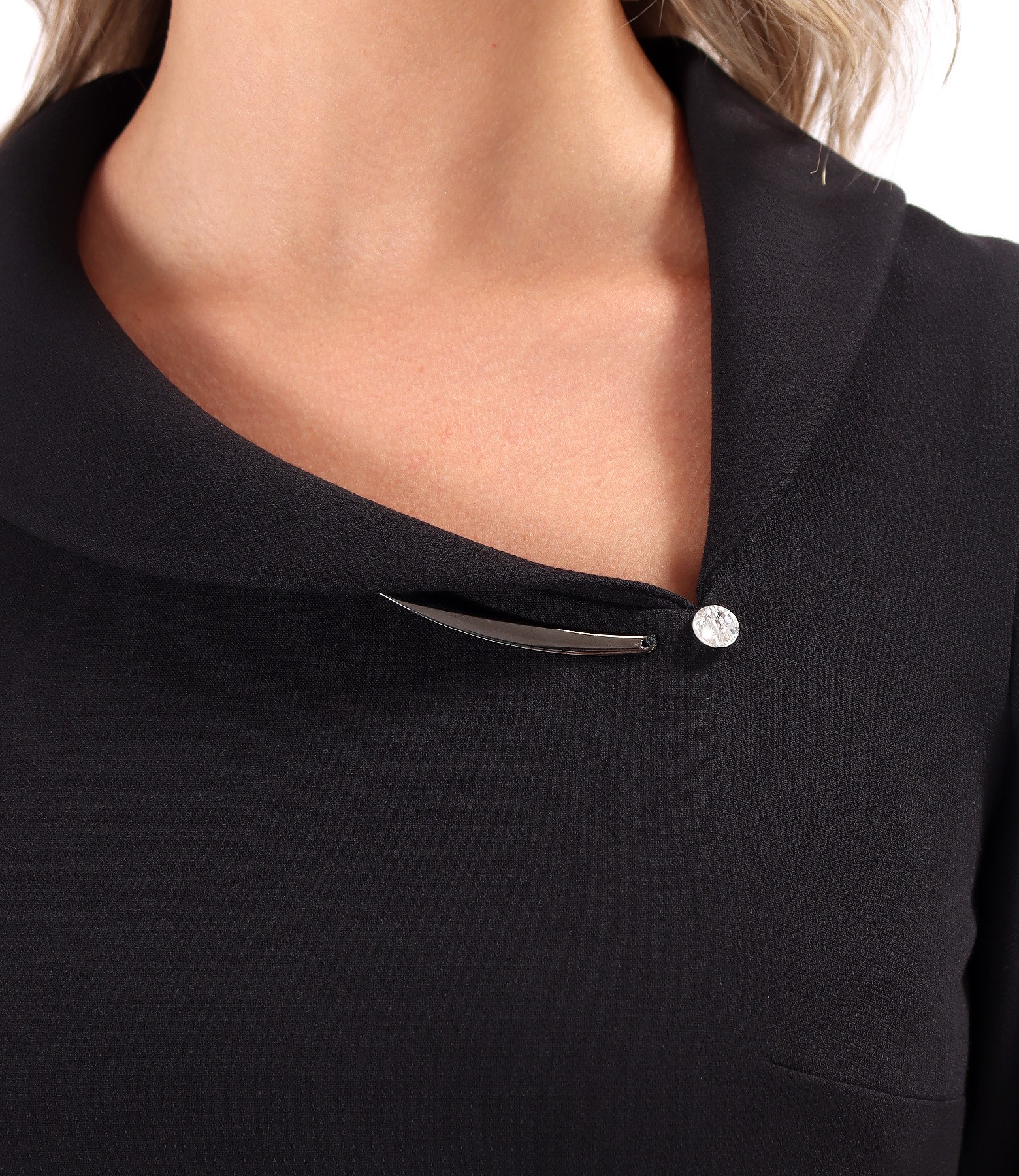Rochie office din stofa elastica cu viscoza, captusita, cu maneci 3/4, guler asimetric si aplicatie metalica si cristal la decolteu. Se inchide cu fermoar ascuns in lateral.