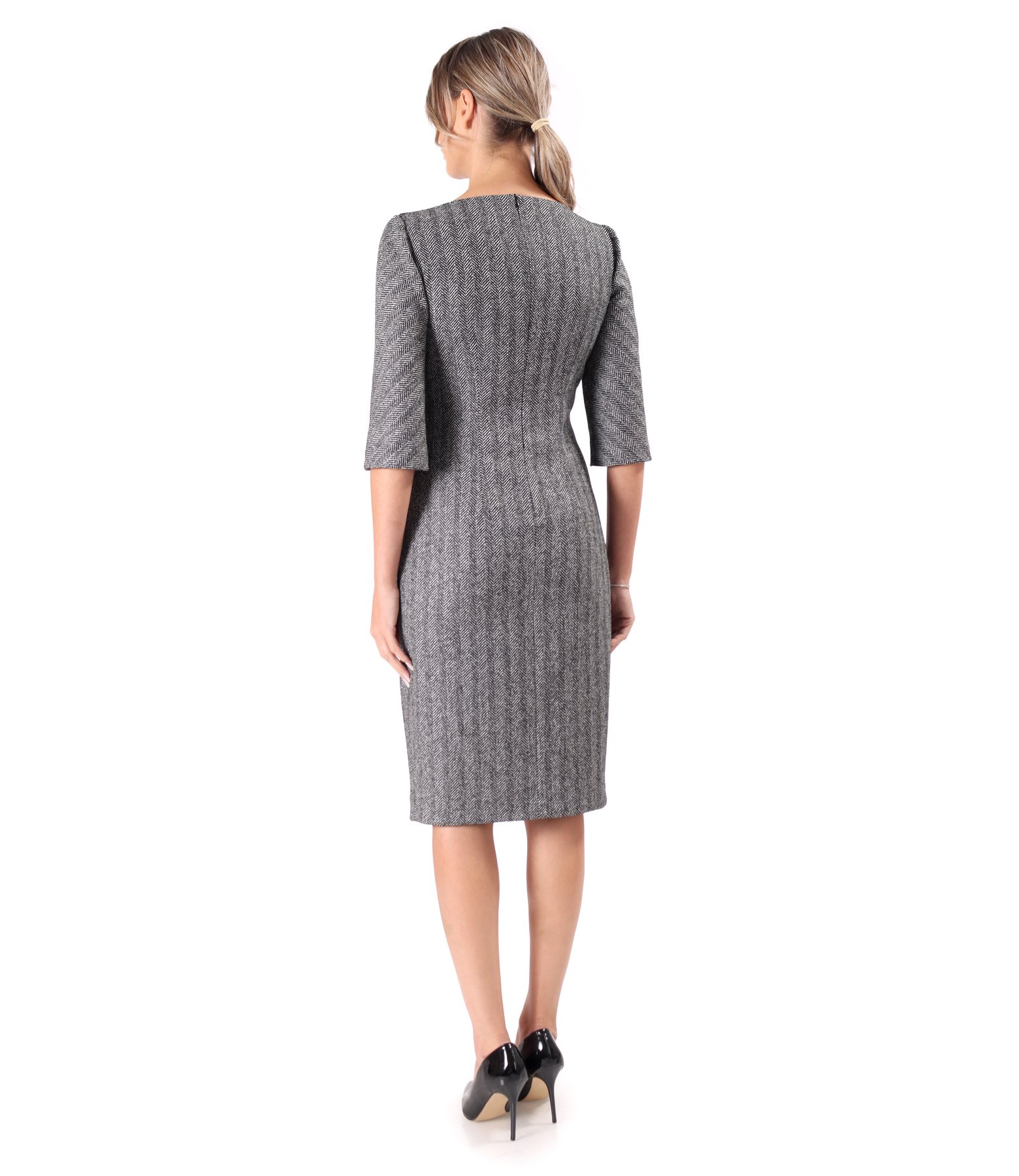 Rochie office din bucle cu bumbac, cu decolteu in V, maneci 3/4 si clape cu banda decorativa negru cu auriu. Se inchide cu fermoar ascuns pe mijloc spate.