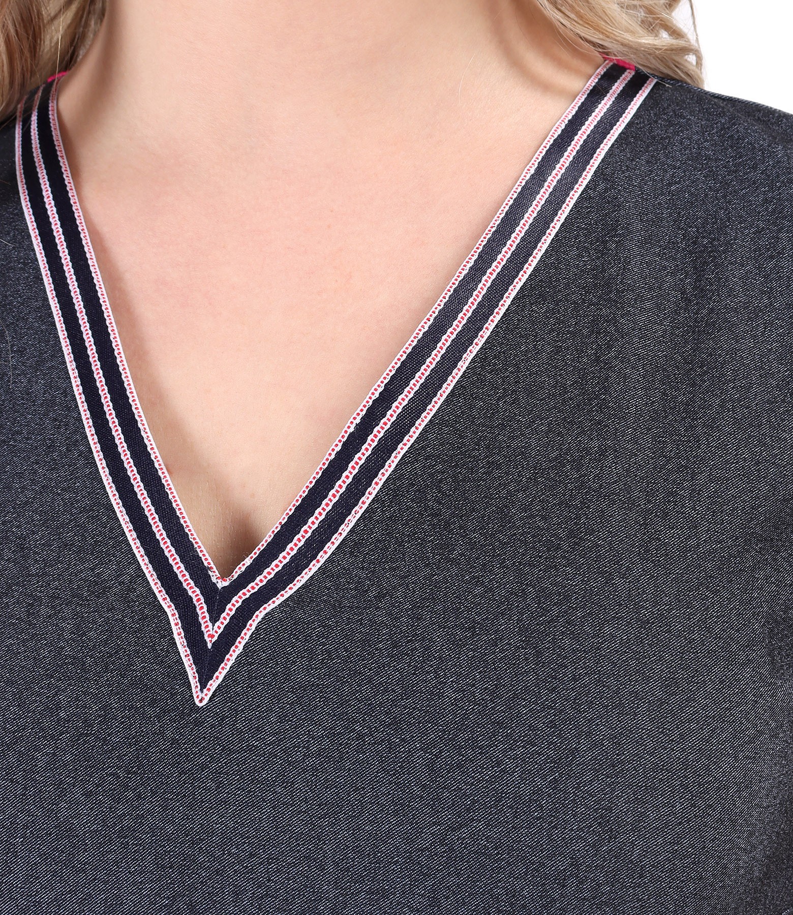 Rochie office din denim elastic, necaptusita, fara maneci, si decolteu rotund cu banda de rips. Nu are sistem de inchidere.
