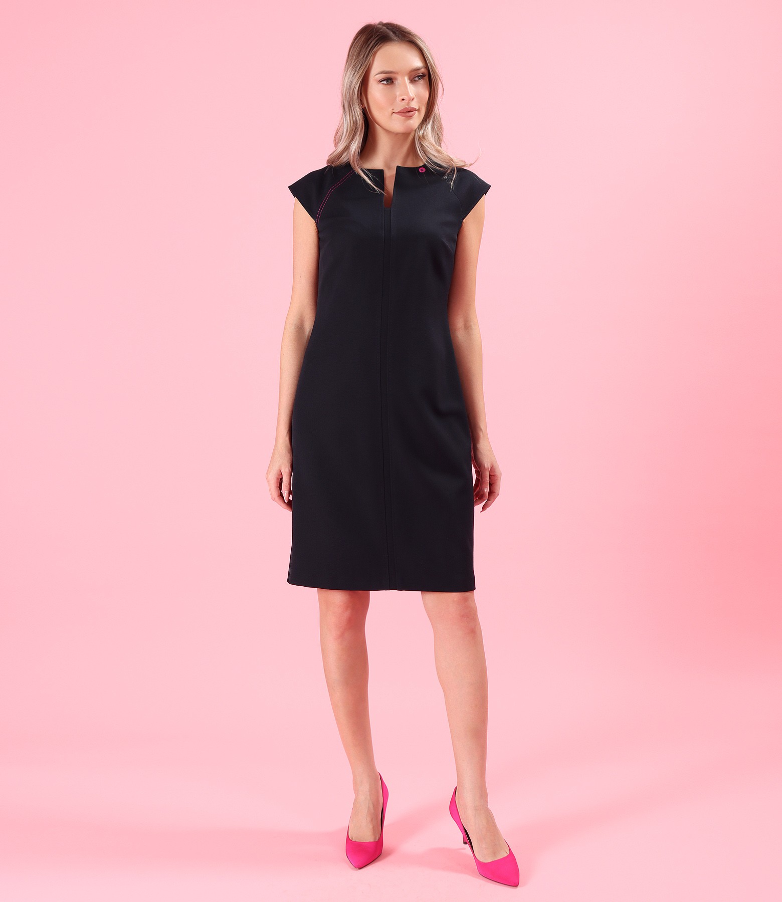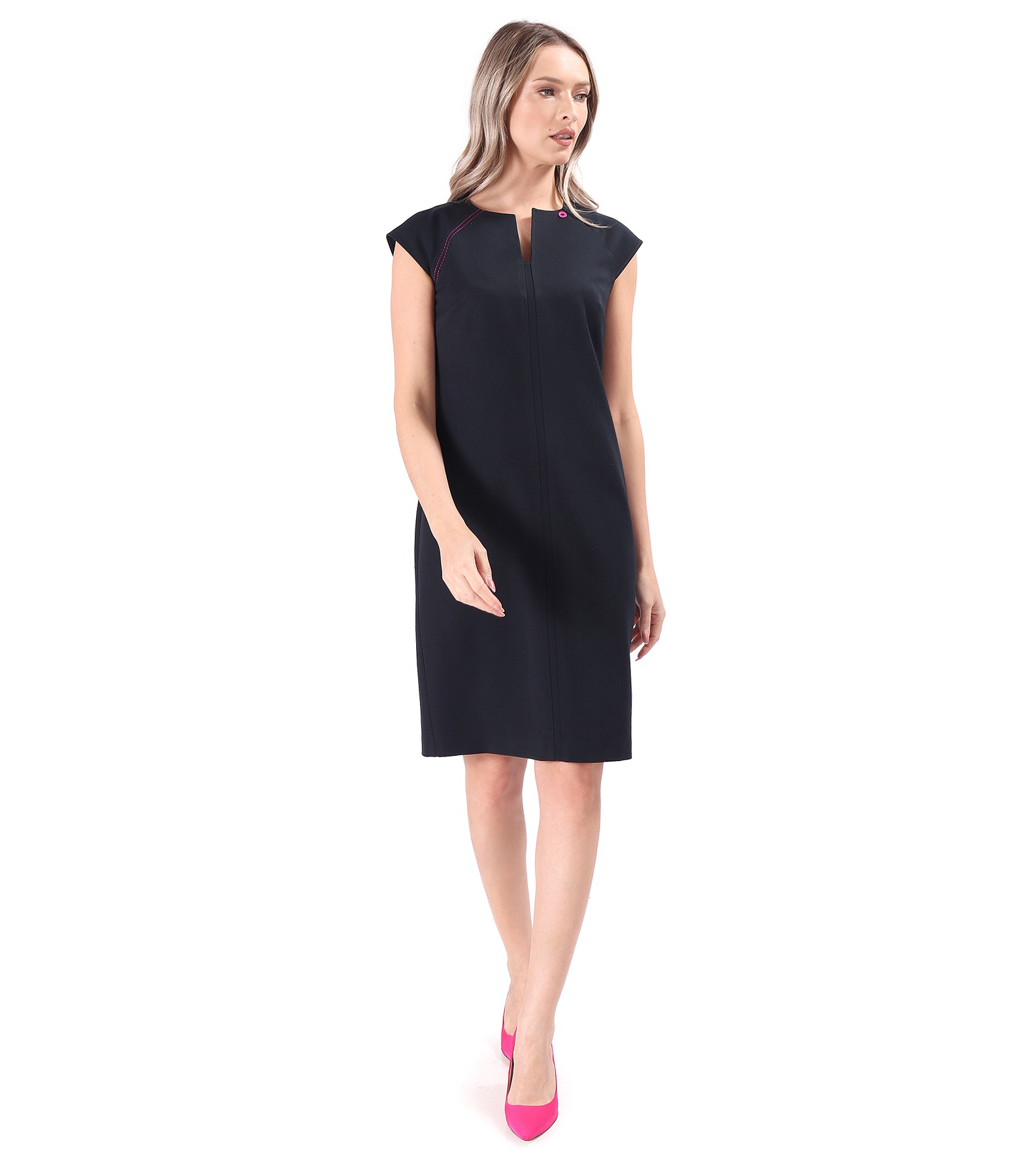 Rochie office din stofa elastica cu viscoza, cu maneci cazute si cusatura decorativa in contrast pe umarul drept. Se inchide cu fermoar ascuns pe mijloc spate.