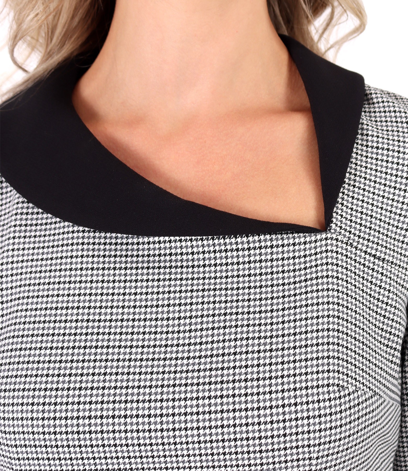 Rochie office din stofa elastica cu viscoza, captusita, cu maneci 3/4 si guler asimetric in contrast. Se inchide cu fermoar ascuns in lateral.
